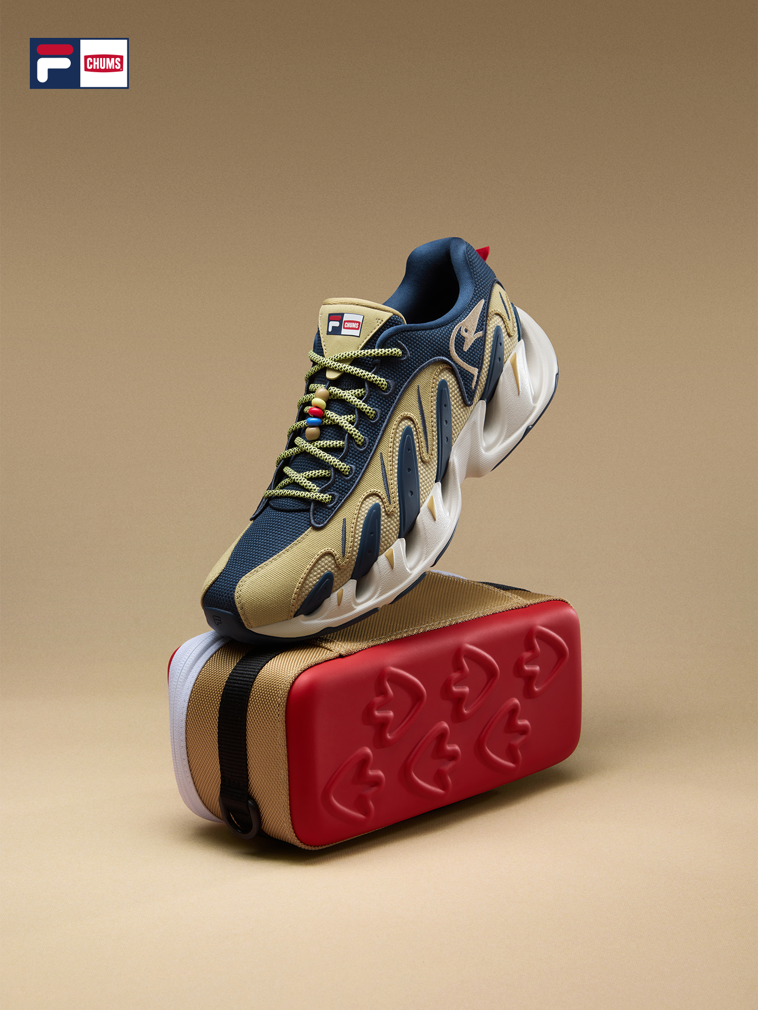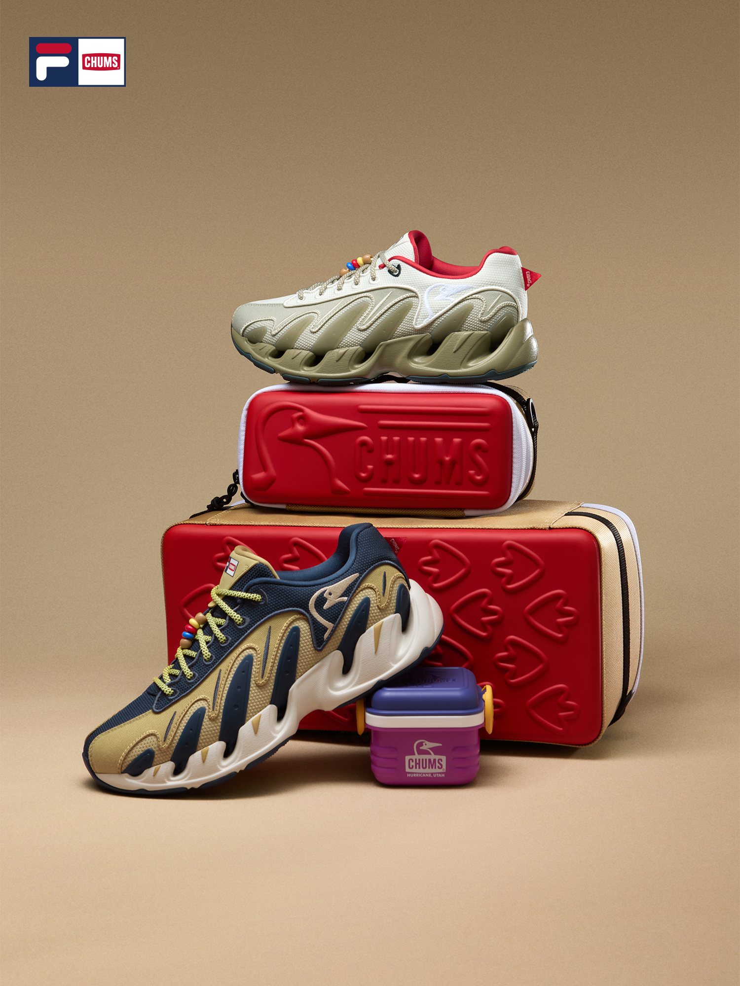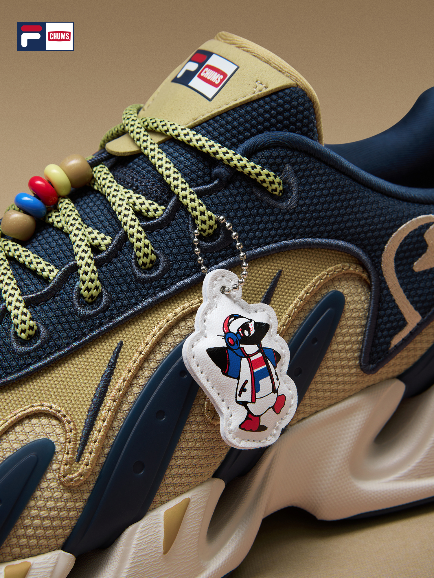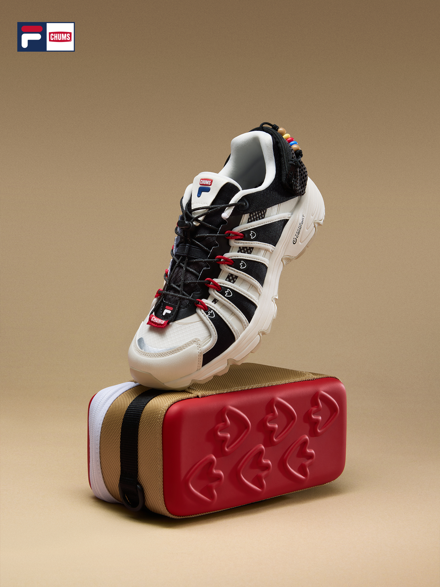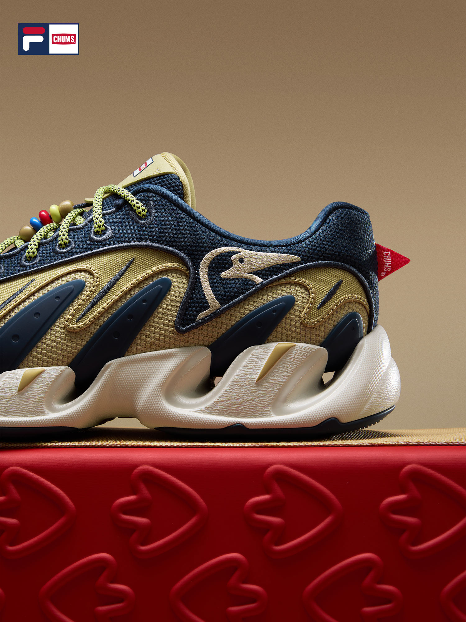 FILA与户外生活品牌CHUMS从「为日常穿搭注入户外趣味」出发,延续FILA FUSION COMO户外鞋的湖系风格,在后跟加入网状口袋结构、隐藏式脚印图案等设计,呼应城市轻户外场景的实用与玩味需求;同时VETTA智酷老爹鞋进行趣味化重构,通过将标志性眼镜绳转化为可调节串珠鞋带、采用左右不对称鲣鸟刺绣等细节,在保持显瘦轮廓的同时,融入CHUMS特有的「实用性趣味」。