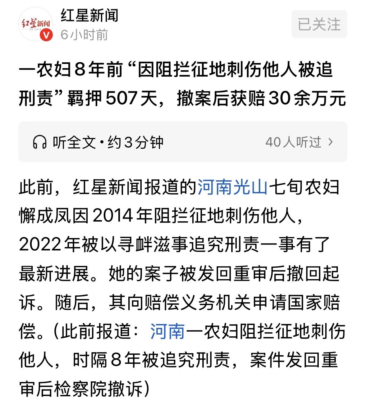 河南信阳,一农妇家的地被建设项目占用,她拉着儿子拼死拼活挡工,冲突中,她不慎刺伤一工作人员,但当下并未被追责,原以为事情过去了,谁料8年后,她因寻衅滋事罪,被判1年6个月,然而,她的案子被发回重审后,因证据不足被撤回,她觉得自己被关得太冤了,直接向法院申请了75万多的赔偿,结局出乎她的意料。 10年前的懈成凤怎么也想不到,为了自家那一亩三分地跟人拼回命,会让她在古稀之年沦为阶下囚,还在看守所里硬熬了507天。 2014年的时候,她们县搞项目,占了懈成凤家的地。 老太太是个地道的农民,地就是命根子。眼看着推土机要来平地,她急了眼,跟着儿子吕兵一起去拦着街道办的人干活,不让清理地上的庄稼和附着物。 拉扯过程中,冲突升级,懈成凤手里的家伙事儿伤了人,把一名工作人员给刺伤了。 当时这事可能因为各种原因没立马深究,可到了2022年9月17号,也就是事情过去8年后,警方找上门了。 2023年10月26号,县法院下了判决,认定懈成凤犯寻衅滋事罪,判了1年6个月。 然而,同一件事,同一个现场,当妈的坐牢了,一起去拦施工的儿子吕兵却没事。检察院直接决定不逮捕、不起诉。 直到2024年,剧情来了个大反转。 12月19号,中院觉得一审这案子“事实不清、证据不足”,直接把原判撤了,发回去重审。 这一重审,县检察院在12月31号突然申请撤诉,说证据不够,不符合起诉条件,当天法院就准了。 紧接着2025年1月13号,检察院正式下了不起诉决定书。 这时候,懈成凤已经被关了507天,从2022年9月17号到2024年2月6号。 一个70岁的老人,在高墙里度过了这段暗无天日的日子。 出来后的懈成凤,身体垮了,精神也受了大刺激。但她是个倔脾气,没就此认命。 她觉得自己被关得冤枉,必须讨个说法。 2025年6月,她向县法院申请75万多的国 家赔偿,包括24万多的人身自由赔偿金,24万多的精神损失费,还有27万的律师费和维权费。 另外,她还要法院公开道歉、恢复名誉,并要求追究当年办错案的人的责任。 光山县法院琢磨了一下,给出的赔偿单子是:人身自由赔偿金24万多给赔,但精神损害抚慰金只给3万,律师费那些乱七八糟的费用一分不给。 懈成凤一看这结果,心3万块就想买走我500多天的牢狱之灾和受的屈辱?她不服,直接上诉到中院。 到了2025年9月,中院的赔偿决定书下来了。 中院把精神损害抚慰金涨到了6万,加上原本的24万多人身自由赔偿金,一共赔30万出头。但律师费和追责的要求,还是驳回了。 拿着这30万,懈成凤心情还是久久不能平复。钱是赔了,可那失去的一年半光阴谁能还回来?在看守所里落下的病根谁能治好? 儿子吕兵面对记者时,看着母亲苍老憔悴的面容,既心疼又愤怒。 他说母亲现在的身体大不如前,经常半夜惊醒,这事儿没完,肯定要继续追究相关人员的责任。 《国 家赔偿法》第17条第2项规定:行使侦查、检察、审判职权的机关以及看守所、监狱管理机关及其工作人员在行使职权时有下列侵犯人身权情形之一的,受害人有取得赔偿的权利:对公民采取逮捕措施后,决定撤销案件、不起诉或者判决宣告无罪终止追究刑事责任的…… 懈成凤于2022年被逮捕,2025年1月因“证据不足”被作出不起诉决定。 虽然期间法院曾作出有罪判决,但最终被撤销且未认定犯罪事实。 根据法律规定,只要公民被逮捕后最终未被定罪,国 家即应承担赔偿责任。 至于关于赔偿范围的界定,法院支持了“人身自由赔偿金”和“精神损害抚慰金”。 两级法院对精神抚慰金的认定差异,从3万增至6万,也反映了司法实践中对老年受害人身心受损程度的裁量。 对于懈成凤主张的律师费、追责费用被驳回,是因为《国 家赔偿法》实行“法定赔偿”原则,律师费等间接损失通常不在法定赔偿范围内,除非属于直接的财产损失。 对于这件事,你怎么看? 关注@运良说法 学法律知识不迷路