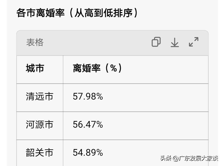 清远、河源、韶关的离婚率都这么高了吗?看到相关数据着实令人心惊。 网上流传着一张去年结婚率和离婚率的情况图,从中可见清远、河源和韶关的离婚率居高不下,均超过了 50%。这意味着两对夫妇结婚,就有一对会离婚,实在是太可怕了。 更让人诧异的是,离婚率高的情况竟出现在这些偏远山区。通常认为,清远、韶关和河源都属于粤北、粤东经济落后地区。一般而言,大家会觉得大城市物质丰富、诱惑众多,离婚率高是正常现象。万万没想到,这种高离婚率的情况竟发生在清远、河源和韶关。 这究竟是怎么回事呢?有人能解释清楚吗? 离婚率排行 全国离婚率榜 大城市离婚率 80离婚率 江苏离婚率 广东人婚姻观念 北方离婚率