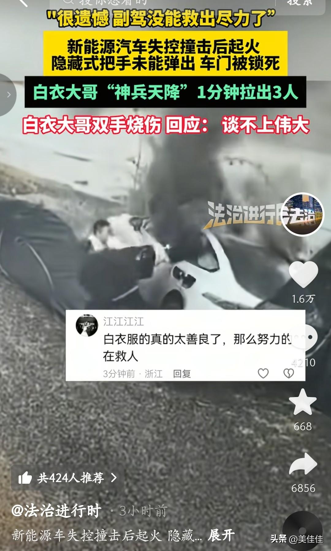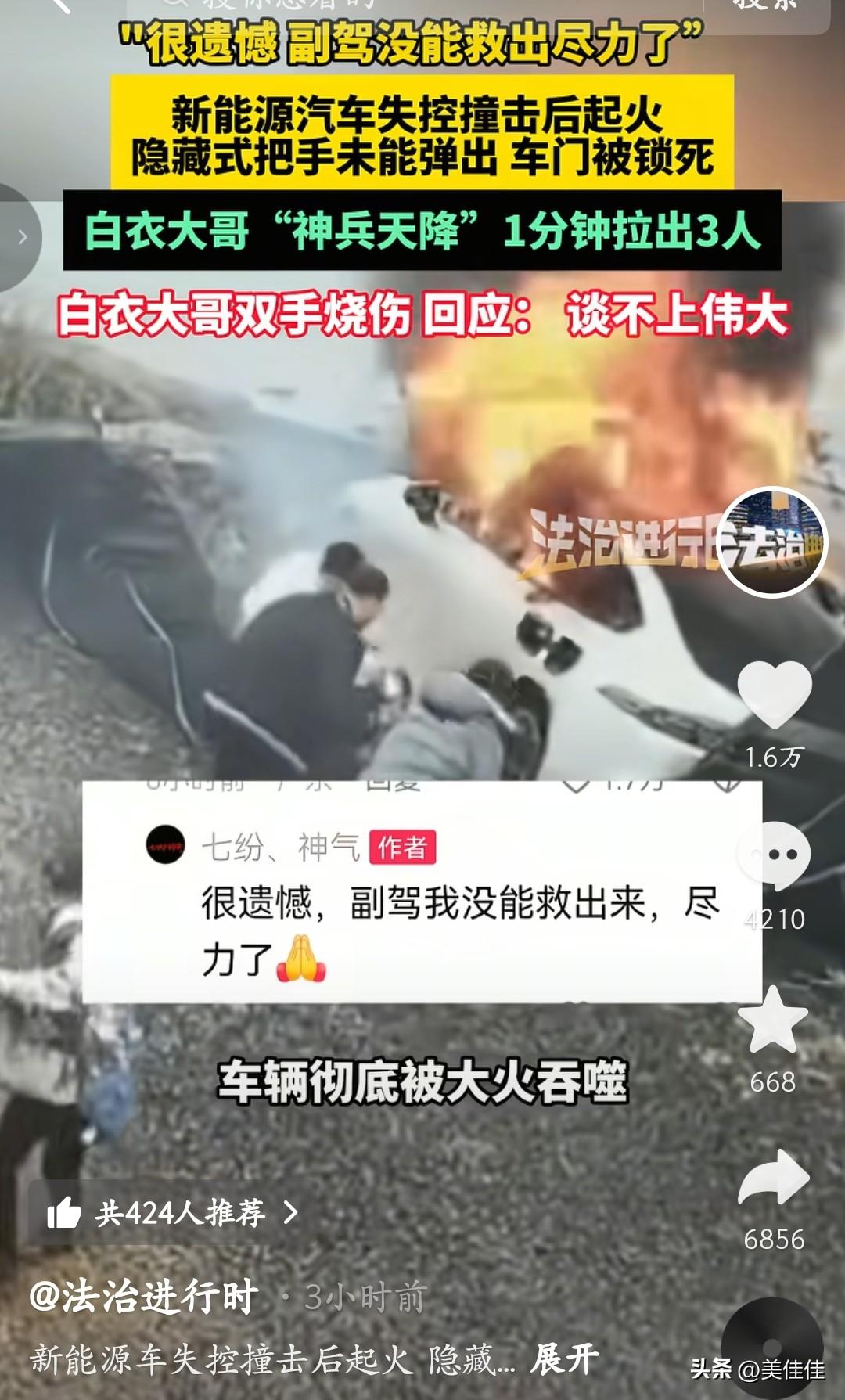 很遗憾,副驾驶的没有救出来! 云南这起新能源车事故看得人揪心。车辆失控撞击后起火,隐藏式门把手没能弹出,车门直接锁死。危急时刻,白衣大哥冲了上来,捡石头砸破车窗,1分钟里拼尽全力拉出3个人,可副驾驶的乘客还是没能救出来。 大哥的双手被严重烧伤,事后只轻描淡写说“谈不上伟大”,但这份不顾自身安危的勇气,足以让人敬佩。而隐藏式门把手在关键时刻失灵,也再次敲响了安全警钟。 愿逝者安息,也希望这场悲剧能让更多人重视车辆安全设计的隐患,别再让这样的遗憾重演。
