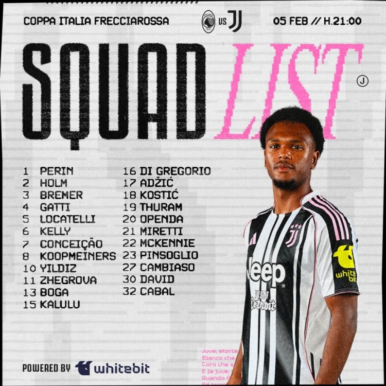 直播吧2月5日讯北京时间2月6日周五凌晨4点,尤文图斯将在意大利杯1/4决赛客场挑战亚特兰大,斑马军团现在公布了大名单。
