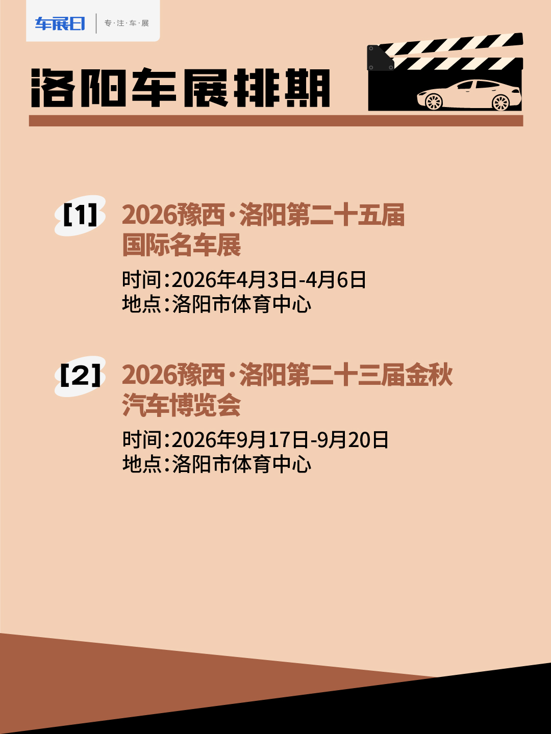 2026年洛阳将举办多场车展,目前定档的洛阳车展有两场,举办地点都在洛阳市体育中心。洛阳国际名车展举办时间在4月3日至6日,洛阳金秋车展将于9月17日至20日举办。更多车展精彩尽在车展日!