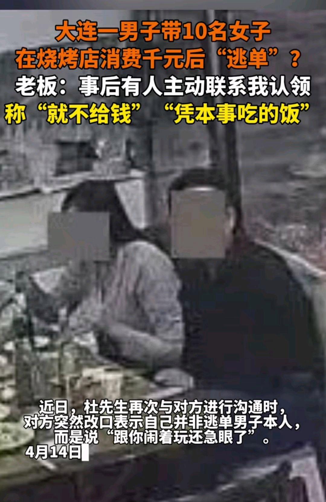 今年4月初,一段内容为“10女1男烧烤店就餐后没结账就走了”的视频流传网络,引起了剧烈反响——监控视频里,一名西装革履的男子带着十个姑娘大快朵颐,临走时却玩起“金蝉脱壳”,留下1050元未结的账单。更离谱的是,4月12日凌晨五点,自称逃单者的神秘人竟主动加微信挑衅:“钱就不给,爱咋咋地!”