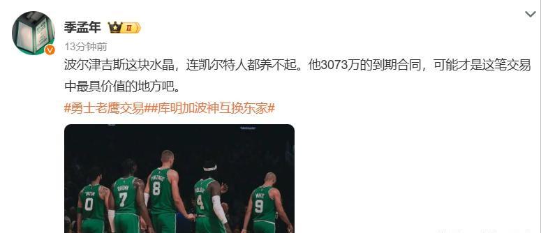 再见字母哥!勇士杀疯了,连续大交易!库明加离队,苏群言之有理[送心] 2月5日,NBA交易大门关闭前的最后一天,金州勇士队完成了一系列阵容调整。勇士与亚特兰大老鹰队达成交易,送出前锋乔纳森·库明加和后卫巴迪·希尔德,换回中锋克里斯塔普斯·波尔津吉斯。这笔交易为纯球员互换,未涉及未来选秀权。   紧随其后,勇士将年轻内线特雷西·杰克逊—戴维斯送至多伦多猛龙,换回一个来自湖人队的2026年次轮选秀权。连续操作标志着勇士管理层在赛季中期对阵容方向进行了主动调整。   波尔津吉斯本赛季价值3073万美元的合同将于今夏到期。送走库明加和希尔德,即便吃进波尔津吉斯的合同,主要目的也被联盟分析人士解读为清理长期薪资,为未来赛季减轻奢侈税压力铺路。   波尔津吉斯的加盟为勇士内线带来了新的维度,这位身高7尺2寸的拉脱维亚中锋,本赛季因伤仅出战17场比赛,场均得到17.1分和5.1个篮板,并拥有35.7%的三分球命中率。   然而,挑战同样存在。波尔津吉斯近年来的出勤率是其最大疑问。如何将他融入以快速传切为核心的战术体系,对主帅史蒂夫·科尔而言是一次全新的尝试。科尔过往更偏爱机动型内线,波尔津吉斯的打法将迫使球队在战术手册中增加新的章节。   对于离队的库明加而言,这是一个新的开始。这位2021年首轮秀本赛季在勇士场均贡献12.1分和5.9个篮板,转投正处于重建阶段的老鹰,有望获得更稳定的出场时间和更重要的进攻角色。希尔德作为联盟顶级射手之一,将立刻提升老鹰队的外线火力。   送走杰克逊—戴维斯则略显意外,这位新秀本赛季曾展现出不错的篮下终结和防守潜力。换取一个未来的次轮签,显示勇士在波尔津吉斯到来后,对内线轮换进行了精简,并积攒了未来的资产。   一方面,利用库里职业生涯最后的巅峰期,尝试引入高天赋球员,为季后赛增加变数,另一方面,极其谨慎地管理着骇人的奢侈税账单,并为库里退役后必然到来的重建阶段保持必要的薪资灵活性和资产储备。   联盟内部观点认为,这更像是一次“财务健康化”操作与“高风险天赋赌博”的结合。波尔津吉斯若能保持健康并融入体系,勇士的进攻将更加立体;若其再度陷入伤病困扰,勇士也成功甩掉了库明加的新秀合同,为今夏自由市场保留了操作空间。   交易截止日的尘埃落定,勇士的赛季走向也因此增添了一个巨大的“如果”。波尔津吉斯究竟是能帮助库里再次向冠军发起冲击的关键拼图,还是会成为又一份很快到期的溢价合同?这个问题的答案,将直接影响勇士未来几年的建队方向。 你看好波尔津吉斯在勇士体系下的适应前景吗?对于勇士而言,在库里时代末期,是应该继续不惜代价引入明星球员冲击冠军,还是应该像这次交易展现的那样,开始为未来重建做务实准备?