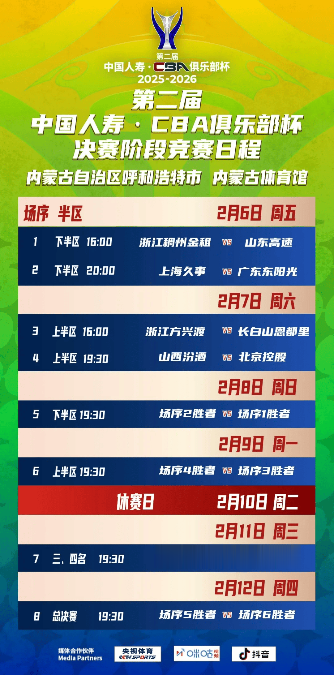 决赛阶段采用单败淘汰制,8支球队将展开激烈争夺。山西汾酒将于2月7日19:30与北京控股展开交锋,争夺半决赛名额。目前球队已到达呼和浩特赛区,全力投入赛前备战。