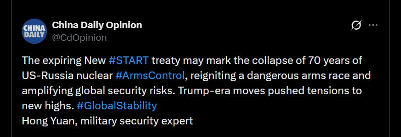 【保险带没了!——从今天开始,世界再无限制大规模杀伤性武器条约】这称得上世界战争与和平特大事件。2026年2月5日,中国日报在推特X上的账号,发表了俺的观点。 打个比方:从此以后,您就徒手攀岩吧!