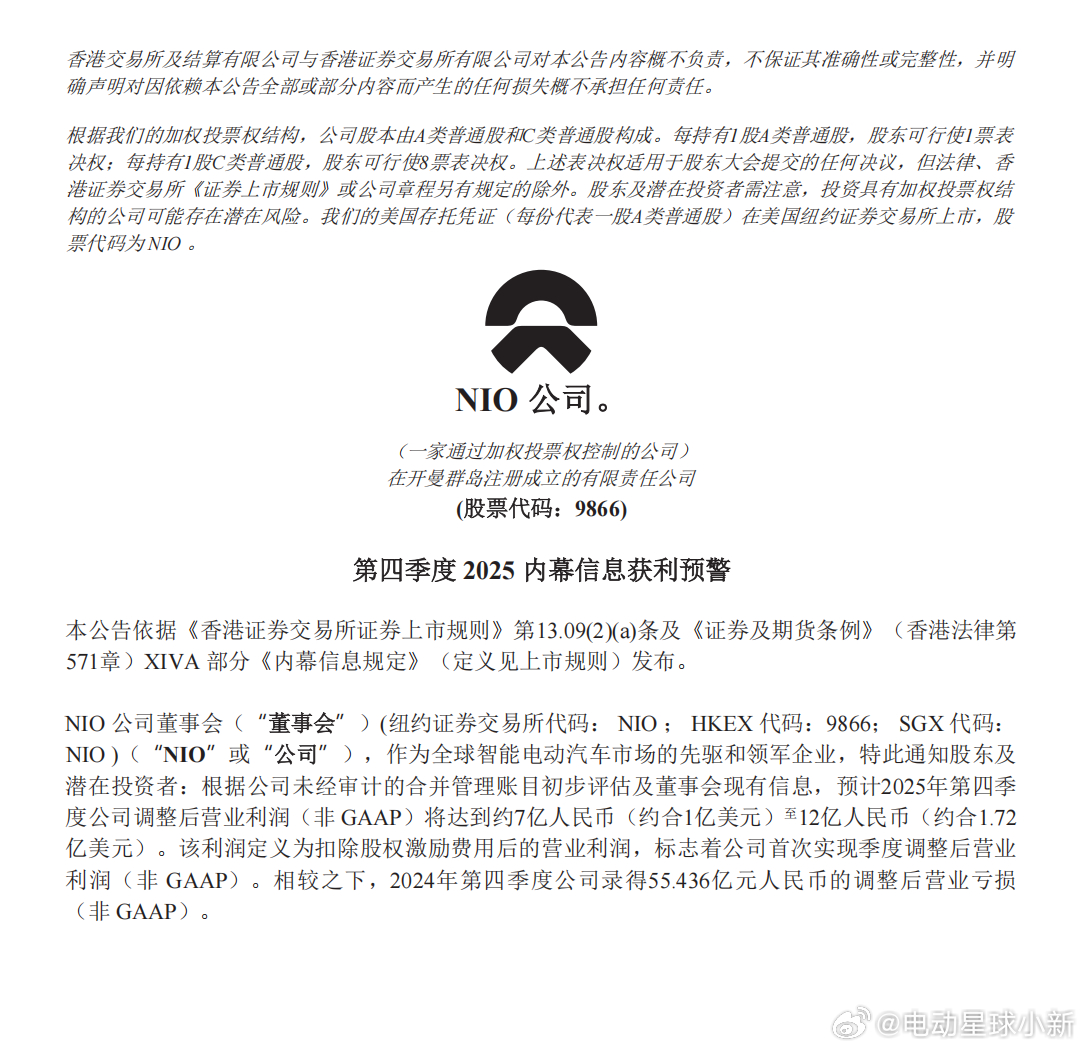 蔚来四季度真的要盈利了!预计经调整经营利润为 7 亿元 - 12 亿元蔚来新能源