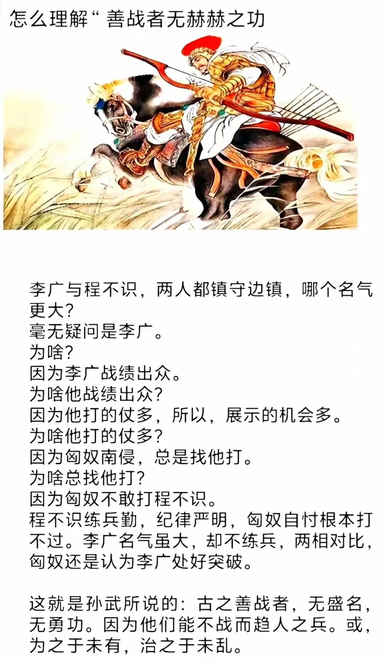 匈奴为何专打战斗经验丰富的飞将军李广,不打几乎没有战斗经验的程不识?因为李广个人勇猛,有勇无谋,输多赢少,不知道插眼,没派足够的斥候,也就是缺侦察兵,行军到处都是漏洞,还两次迷路,明显的菜鸡,匈奴遇到李广,就是刷经验包,与耍牛一样爽,故意放他回去,让他再败。 程不识出战时,扛着几座防御塔,四面八方都有斥候探路,哪个斥候失踪,代表该方向有敌军,他程不识治军极其严苛,行军时部队保持紧密阵型,扎营后会设置多重拒马和瞭望哨,军营24小时有大量人员巡逻警戒,即使遭遇突袭也能迅速结成防御阵形,匈奴根本无法击破其阵型,匈奴打程不识捞不到任何好处,程不识善战无功。