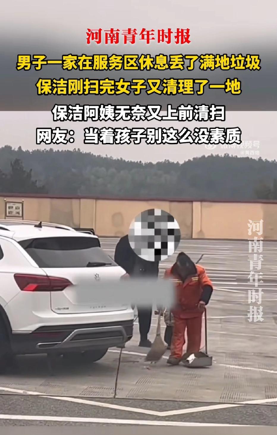 近日广西南宁,一36岁男子停车在服务区休息,男子老婆趁着休息时间把车里的垃圾直接清理到了地上,保洁阿姨看见后连忙过去打扫,没想到刚打扫完,男子老婆又倒了一地出来! 阿姨没办法,看见刚打扫干净的地面又堆满垃圾,又继续第二次过去打扫,保洁阿姨也是很无奈啊!网友看见后,都不淡定了,当着孩子的面呢?还这么没素质,真是无语!虽说服务区是公共场所,但是也要爱护环境啊,这样随意丢垃圾到地上太不文明了!