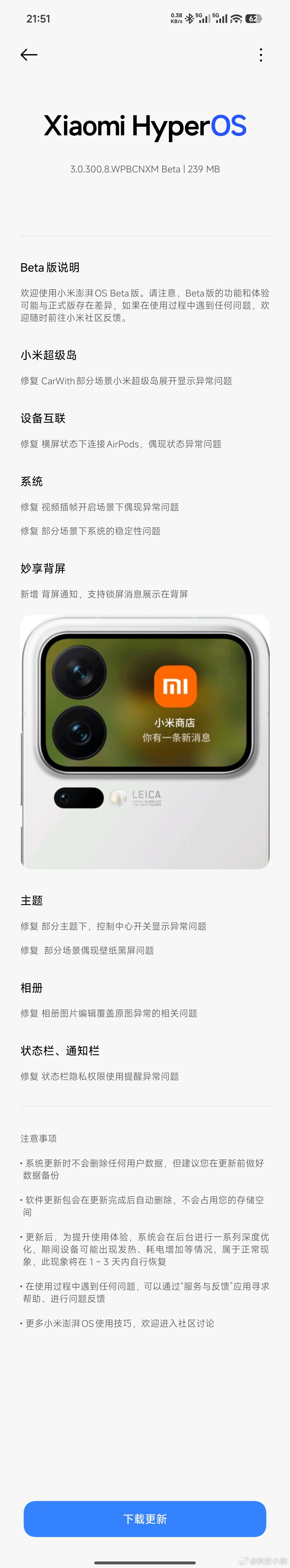 小米澎湃OS3 手里的小米17 Pro Max前几天刚收到Beta版推送,然后没两天有收到一次,最重要的是这次不需要重启,查了下是叫SOTA推送(仅更新系统预装APP),有点意思哦!