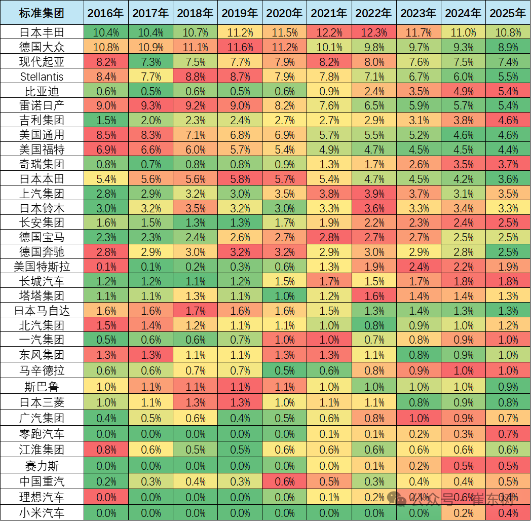 除了铃木和塔塔等印度市场较好的因素促进,其它国际品牌份额2025年全面较大地下滑。