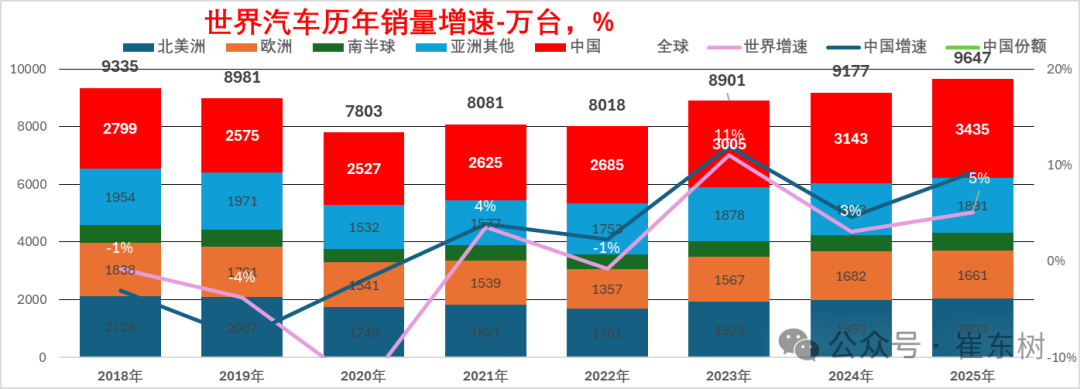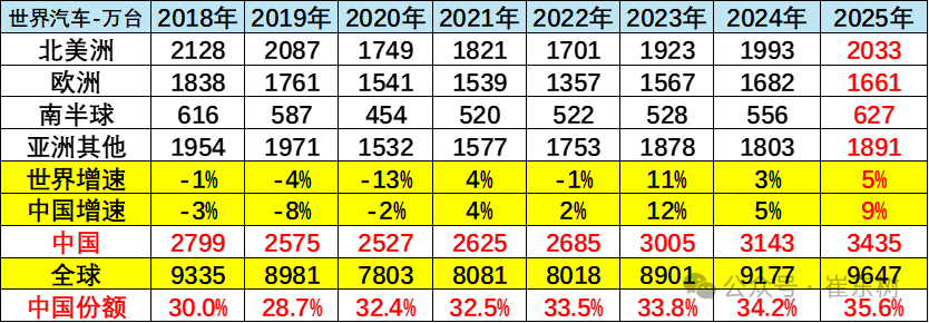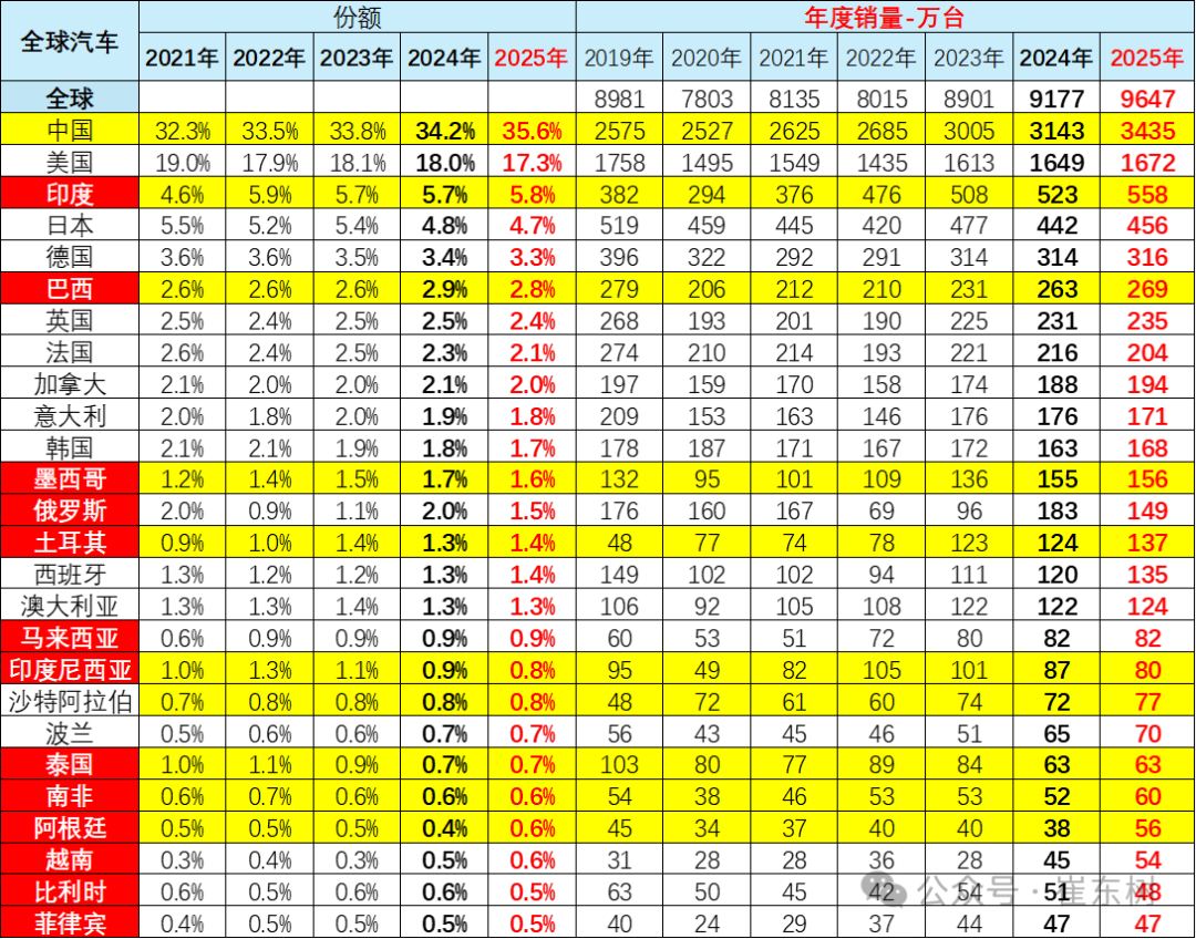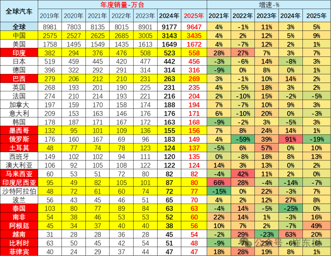 2025年1-12月的全球汽车销量增长5%,其中中国汽车销量3435万台增长9%,美国销量1672万台增1%,印度销量558万台增7%,日本销量456万台增3%,德国销量316万台增1%。目前看中国市场最有活力,增速快。俄罗斯市场下滑严重,墨西哥的增速放缓,而南美的阿根廷等市场表现较好。