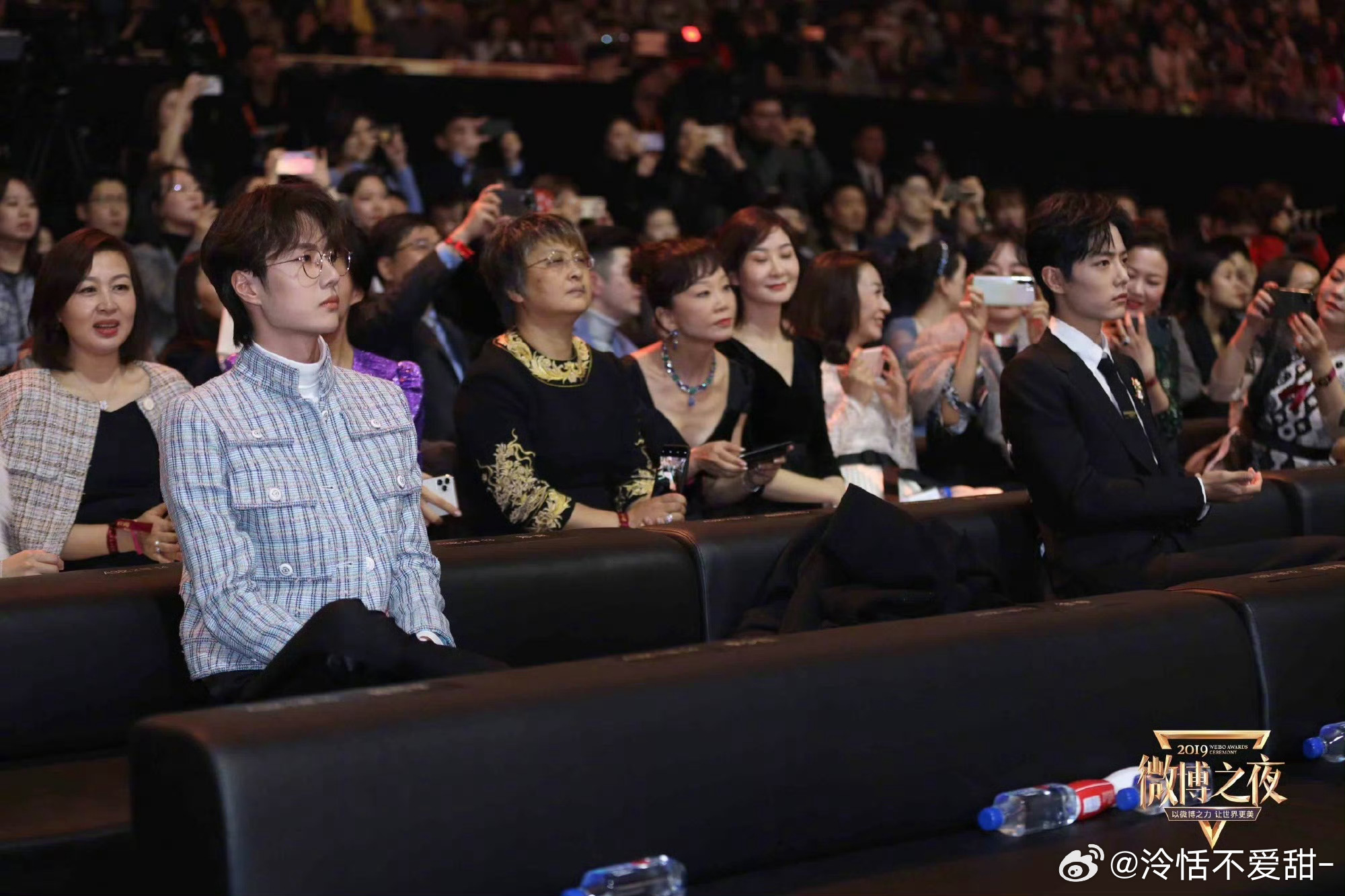 你们知道肖战王一博座位中间只隔了三个人是什么含金量吗!大概就是肖战出去的时候 可以用水杯碰王一博的脚!!!给我一键回到2019年了,,,微博之夜 真婚礼