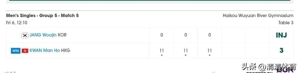 2026海口亚洲杯男单第5组,关文皓3-0拿下张禹珍,张禹珍因伤退赛,有点可惜。