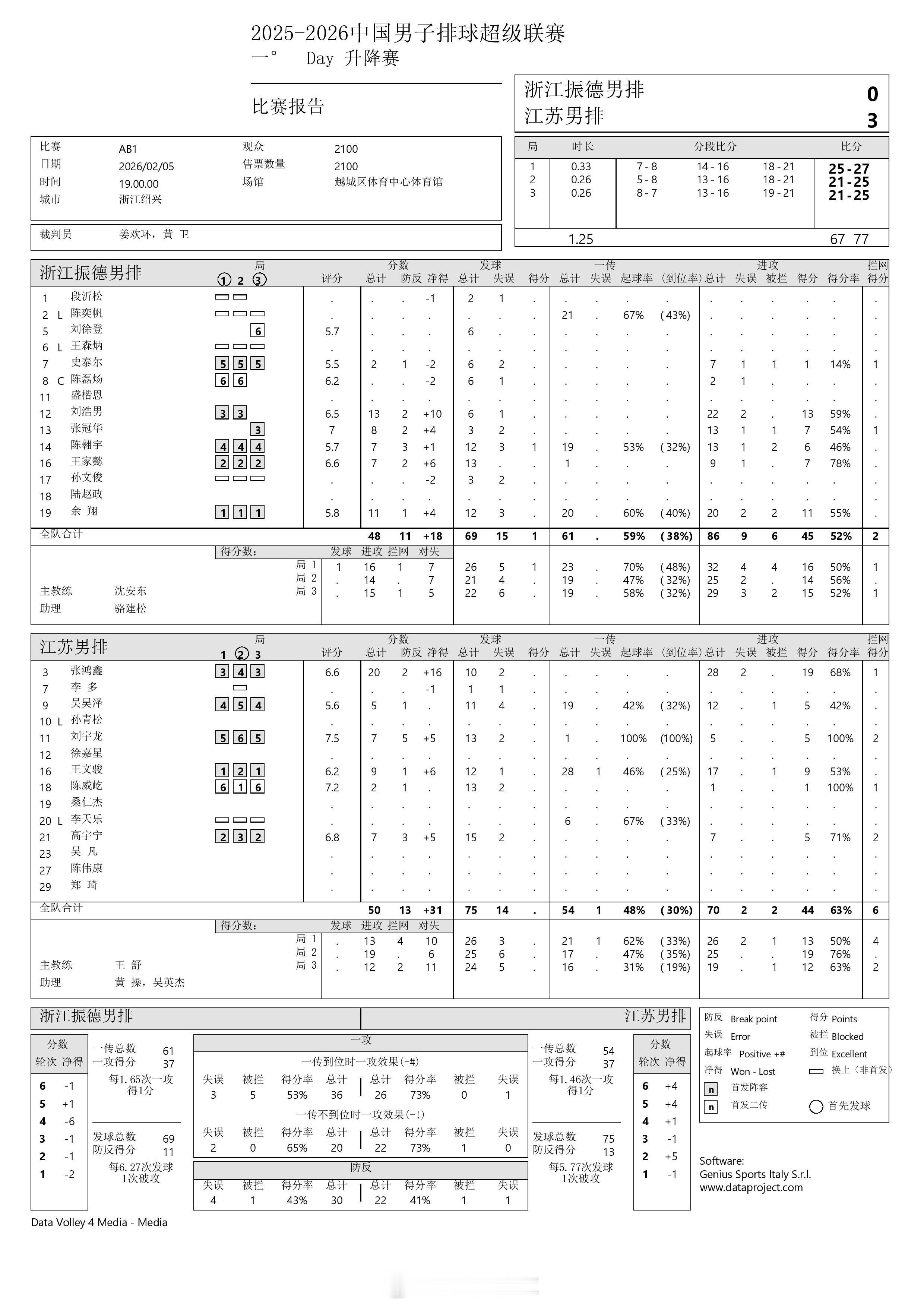 【中国男排超级联赛 浙江0-3江苏】2月5日晚,赛中升降赛首回合,浙江振德在主场以0-3(25-27, 21-25, 21-25)不敌江苏男排。刘浩男13分,余翔11分,张冠华8分,陈翱宇、王家懿各7分;张泓鑫20分,王文骏9分,刘宇龙、高宇宁各7分,吴昊泽5分。