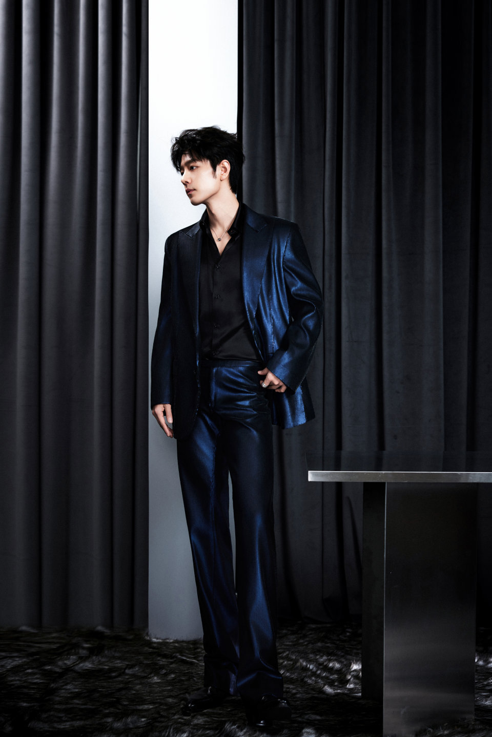 肖战第二套一套深蓝色西装,展现了青年演员肖战在微博之夜上的得体风采。据时尚媒体解读,这套由品牌特别定制的服饰,巧妙融合了现代工艺与传统美学,其暗蓝色的金属光泽内敛而富有质感。