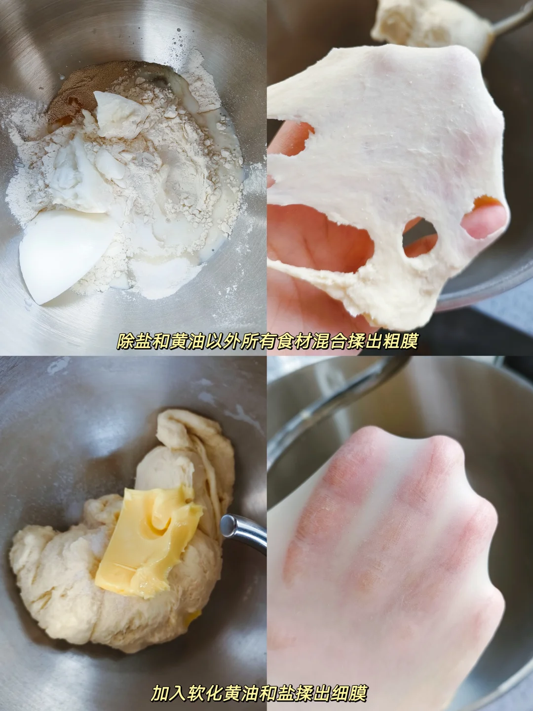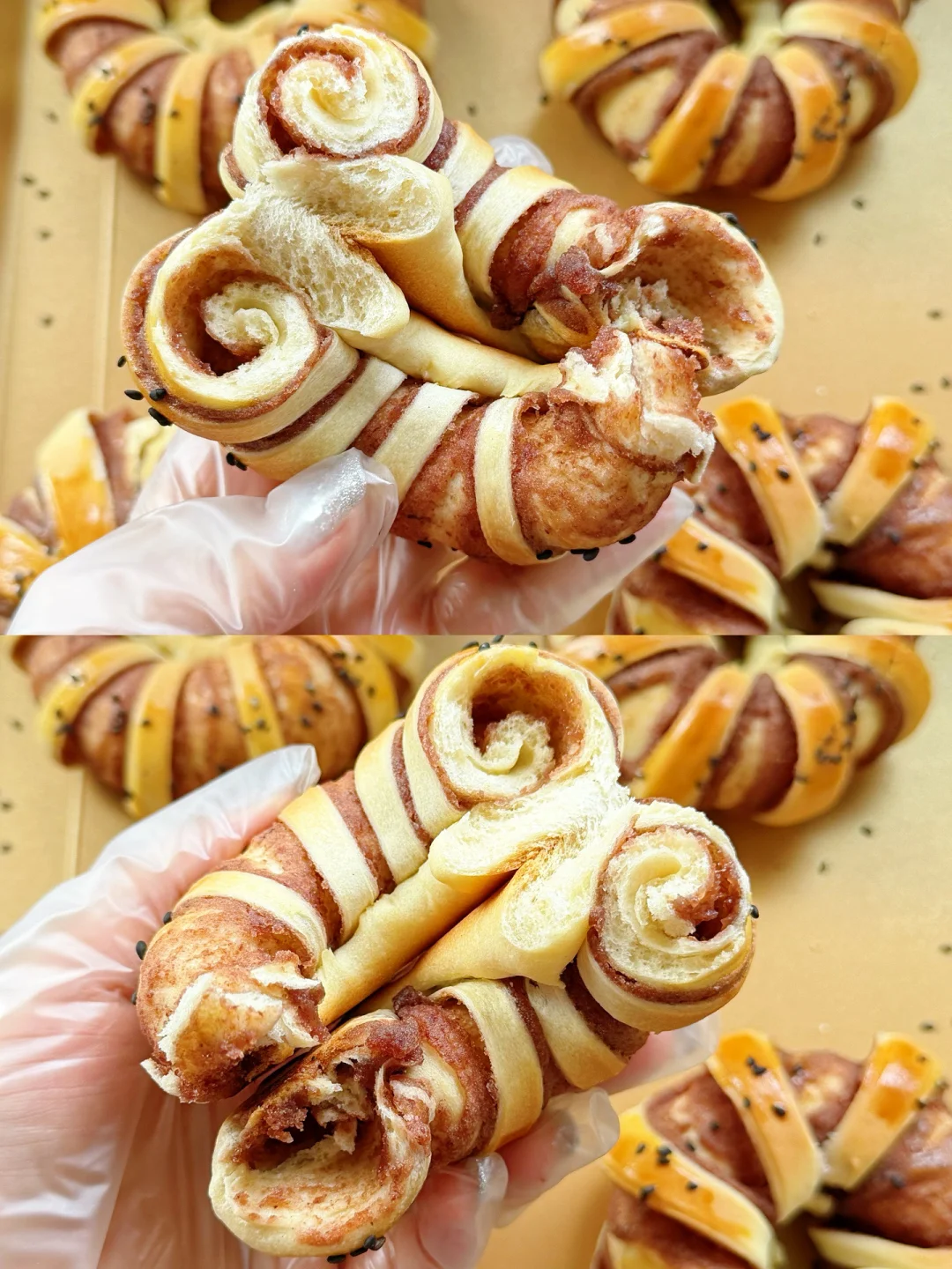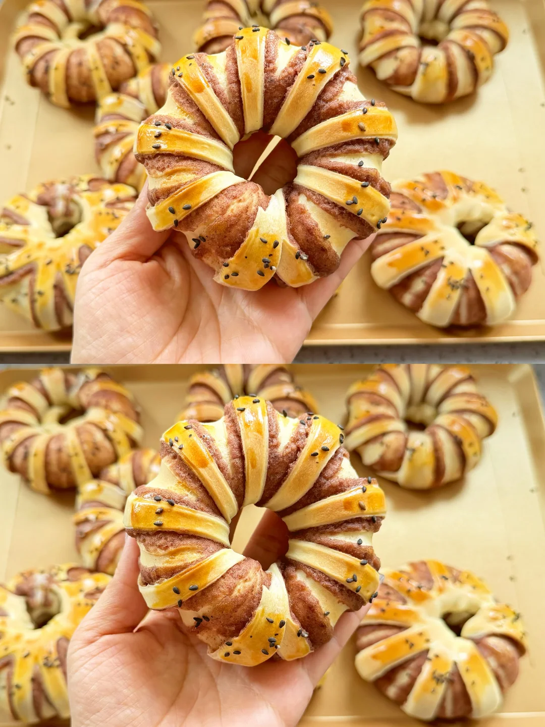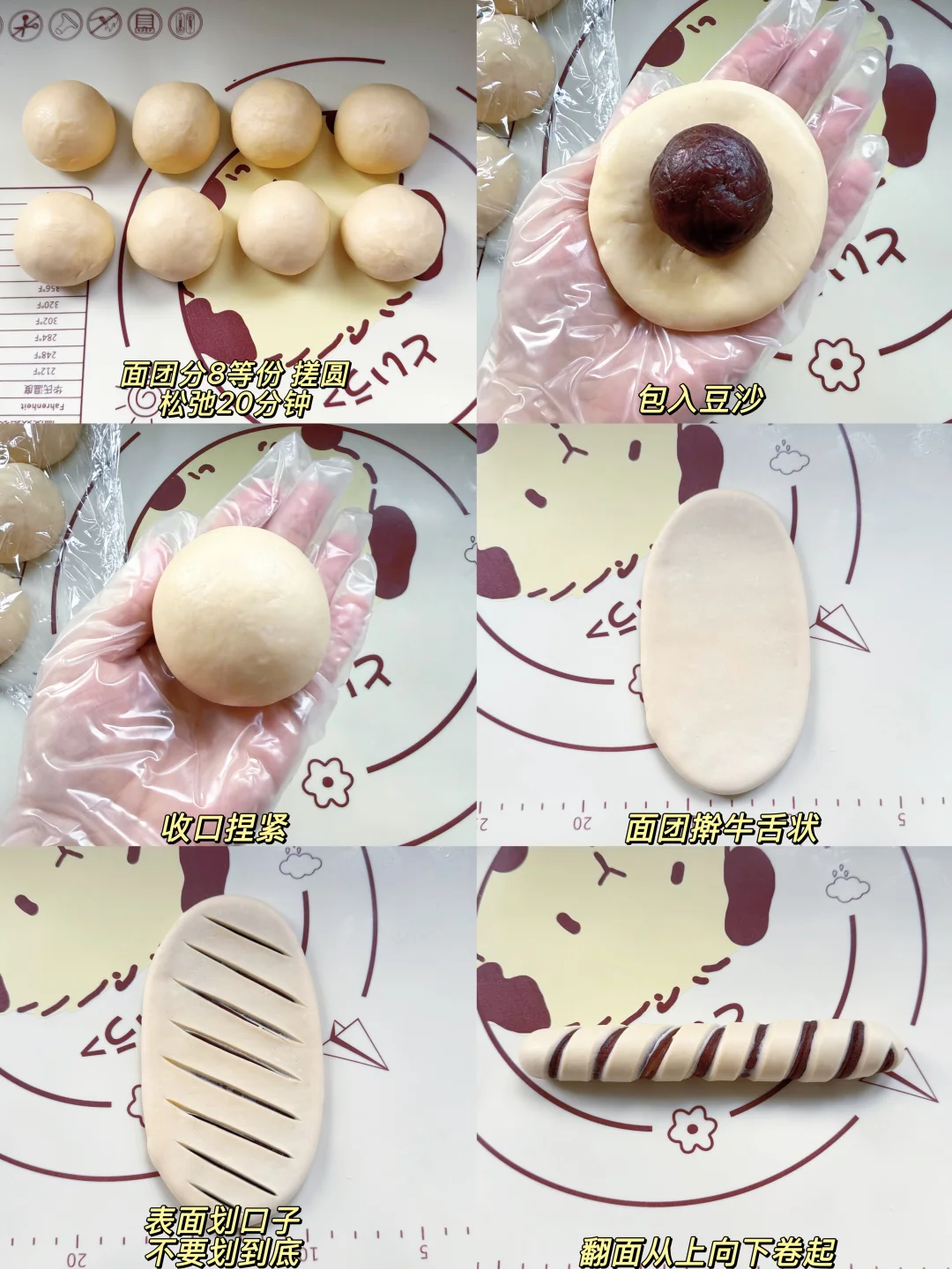 童年回忆啊 自制豆沙面包圈 做法简单,但是超级好吃 柔软香甜,你们一定要试试~ [彩虹R]高筋粉250克,耐高糖酵母3克,蛋液30克,冰牛奶140克,糖25克,奶粉10克,黄油25克,豆沙200克。 [一R]除黄油以外所有食材混合,厨师机2档2分揉至无干粉,转5档8分钟揉出粗膜,加入软化黄油,继续5档8分钟揉出细膜。 [二R]面团分8等份,盖保鲜膜搓圆松弛20分钟(松弛期间准备豆沙馅,一个25克),面团擀开包入豆沙馅,收口捏紧朝下,继续擀成牛舌状,用刀片表面划口子,不要划到底,翻面从上向下卷起,收口处捏紧,一头包住另一头,摆入烤盘,烤箱里面放一碗热水,35度发酵45分钟,发酵两倍大。 [三R]发酵好,表面刷蛋液,撒芝麻,烤箱上火180度下火170度烤20分钟,就好啦~