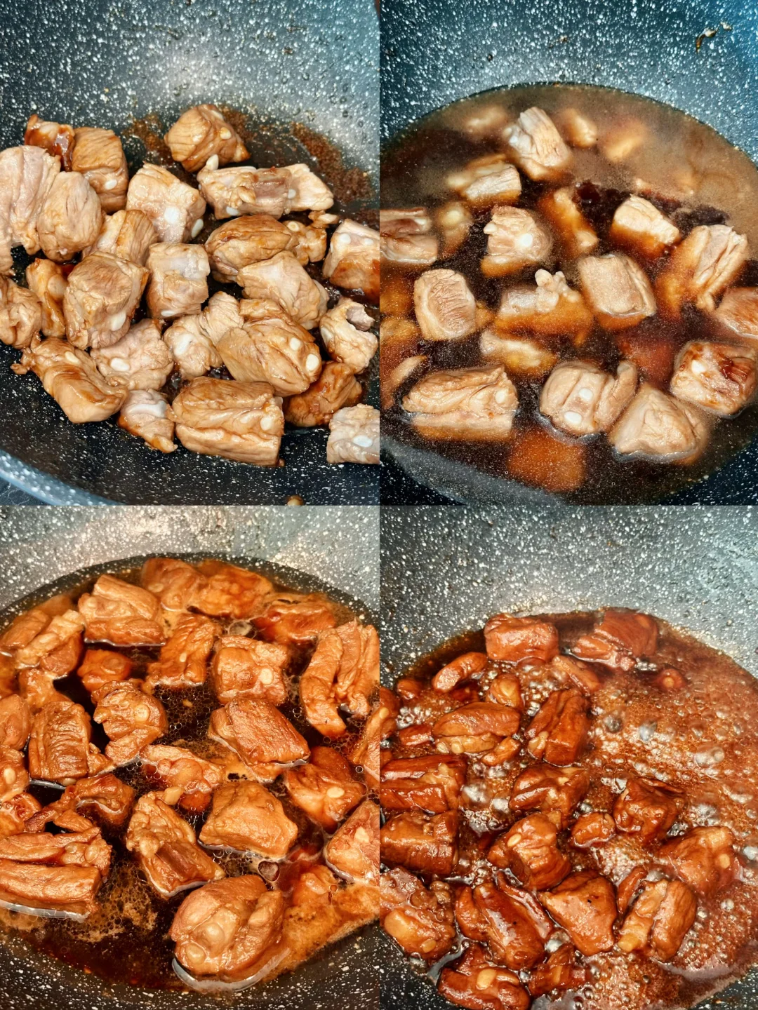 放入排骨快速翻炒,嘻嘻每次成功炒糖色,看到排骨不加老抽都呈现好看色泽,就很有成就感!
