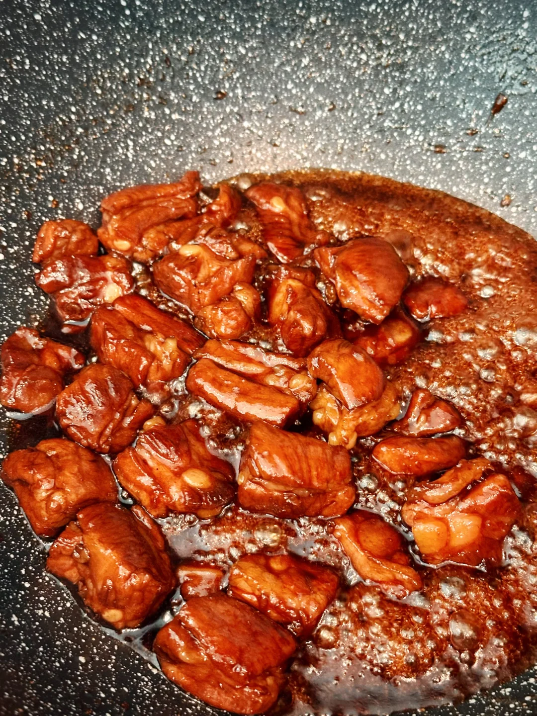 大概煮一小时,里面的汤汁煮到只能盖住排骨1/3高度了,加入两大勺醋,大火开始收汁,期间记得翻炒防粘;