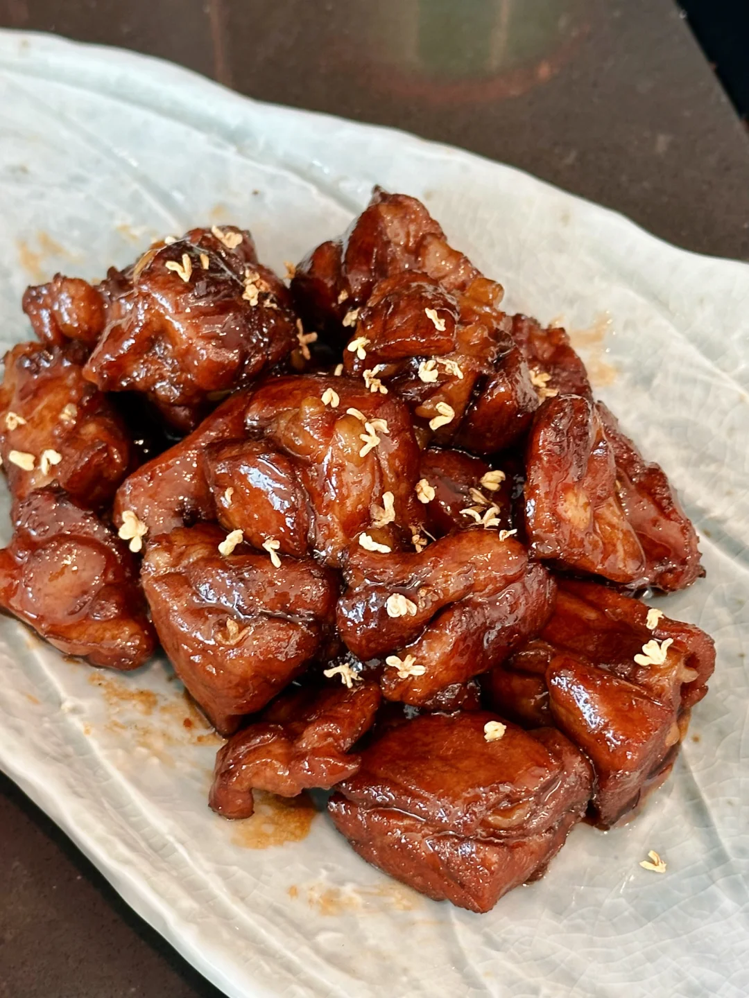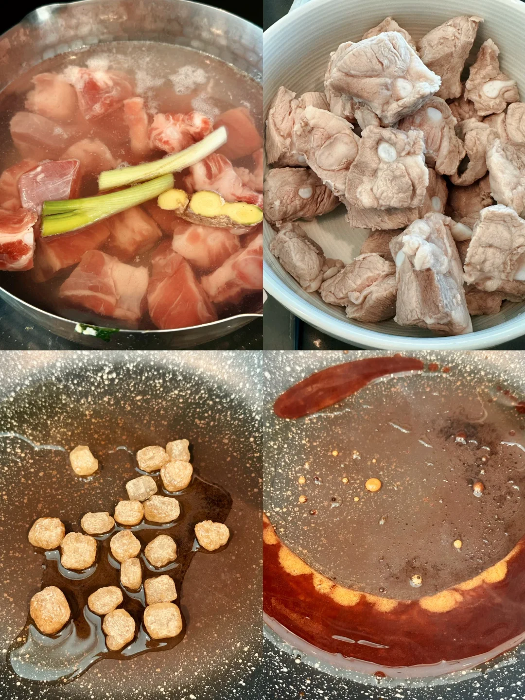 猪小排500g,葱姜料酒,食用油1tbsp,冰糖16-20小粒,生抽2tbsp,老抽0.5tbsp,balsamic醋2+1tbsp,芝麻和桂花。