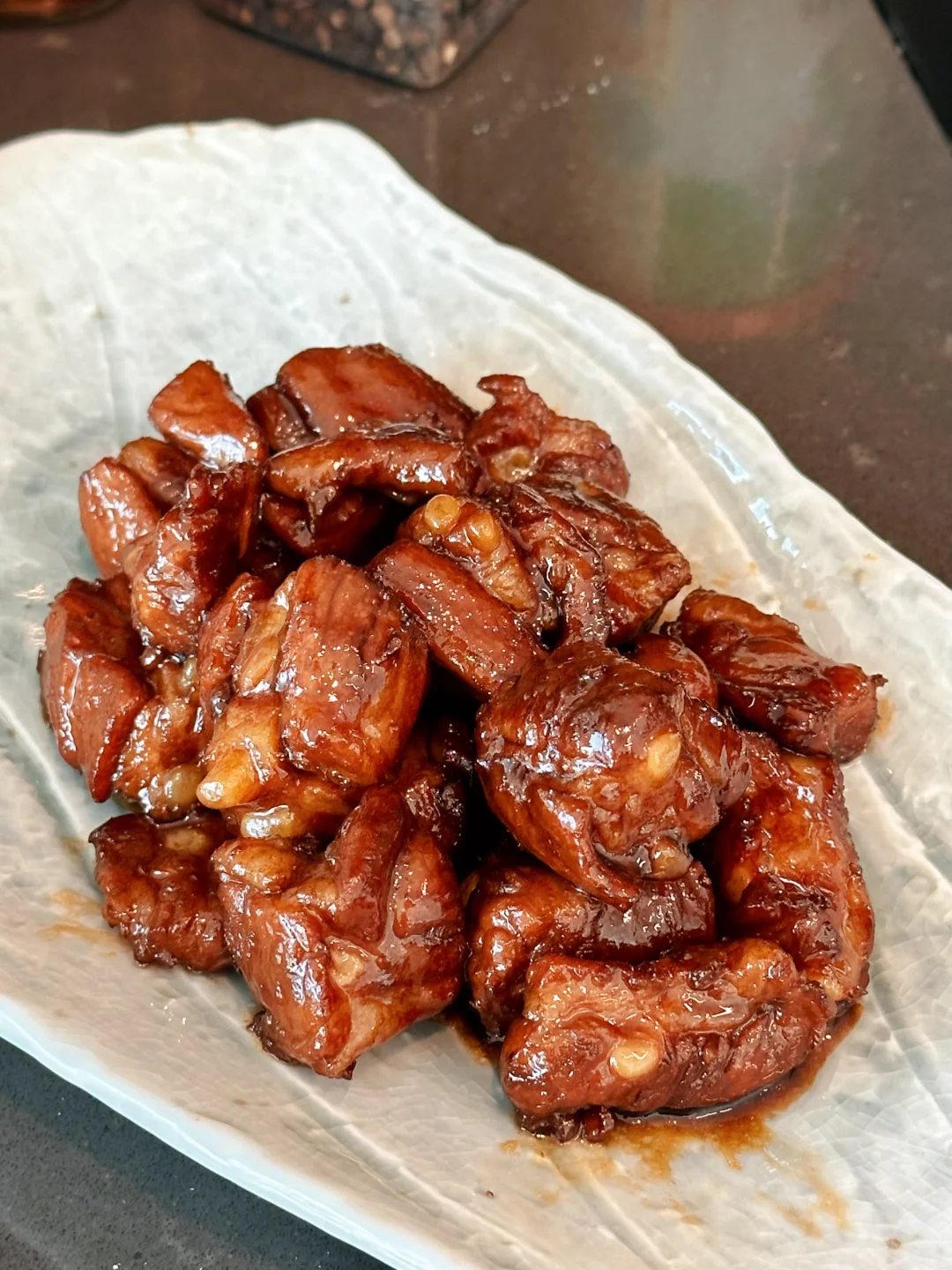 我用了我妈做糖醋排骨的经典做法,但所有醋都是用的balsamic,效果如图!这色面,一看就超好吃对不对!我们排骨做好了晚上招待朋友,结果多余的酱汁也不舍得扔,直接午饭拿来拌米饭!