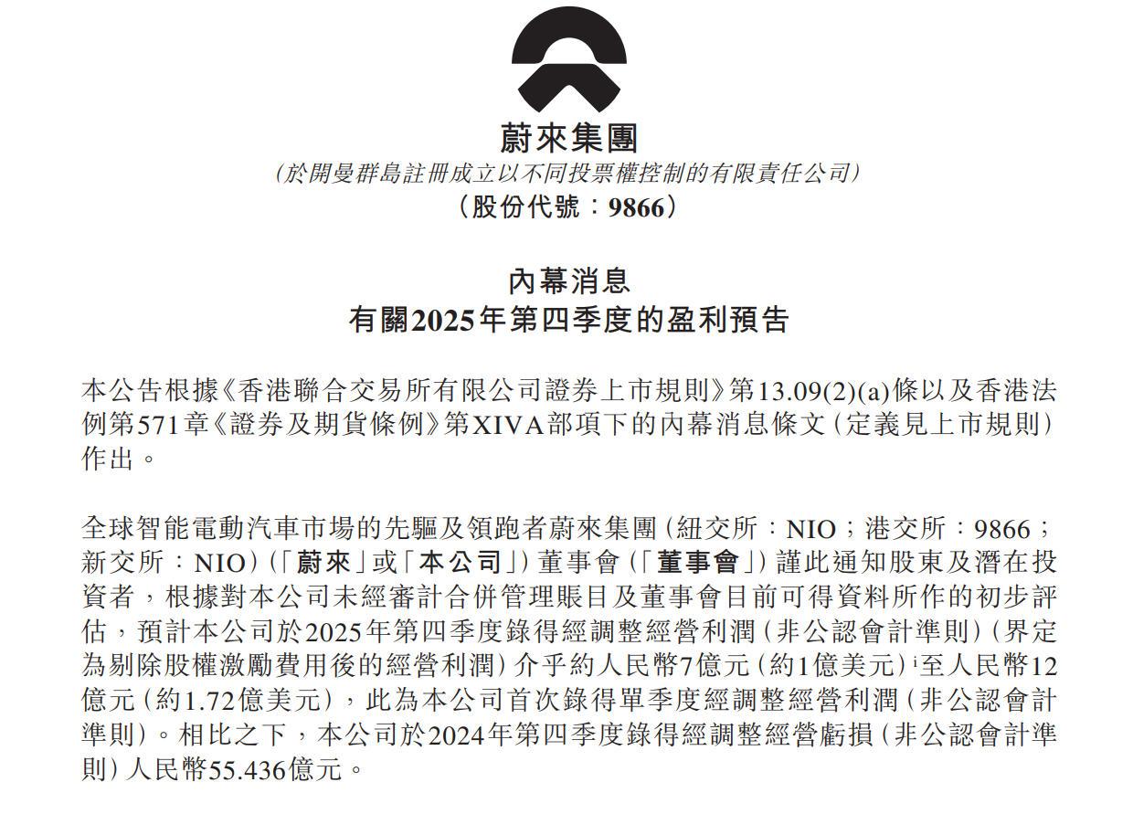 终于,蔚来汽车盈利了,是自创立11年以来首次单季度盈利,李斌兑现了他此前的诺言。 蔚来汽车发布的公告显示,预计公司于2025年第四季度获得经调整经营利润(非公认会计准则)7-12亿元,同比扭亏为盈。其之所以能有此业绩,有三方面原因:1、公司2025年第四季度销量持续增长;2、有利的产品组合推动汽车毛利率优化;3、公司持续推行全面降本增效措施。 3个原因用大白话理解就是:车卖得多了、并且毛利高的车卖得多,同时控制了开支,即开源节流。 或受此利好刺激,蔚来港股2月5日上涨2.7%。而在美股方面,受盘前利好刺激,截止发稿,蔚来美股高开略回落,涨幅为7%。 蔚来汽车的此番表现,再度表明了汽车行业的基本规律——规模致胜。【来自懂车帝车友圈】