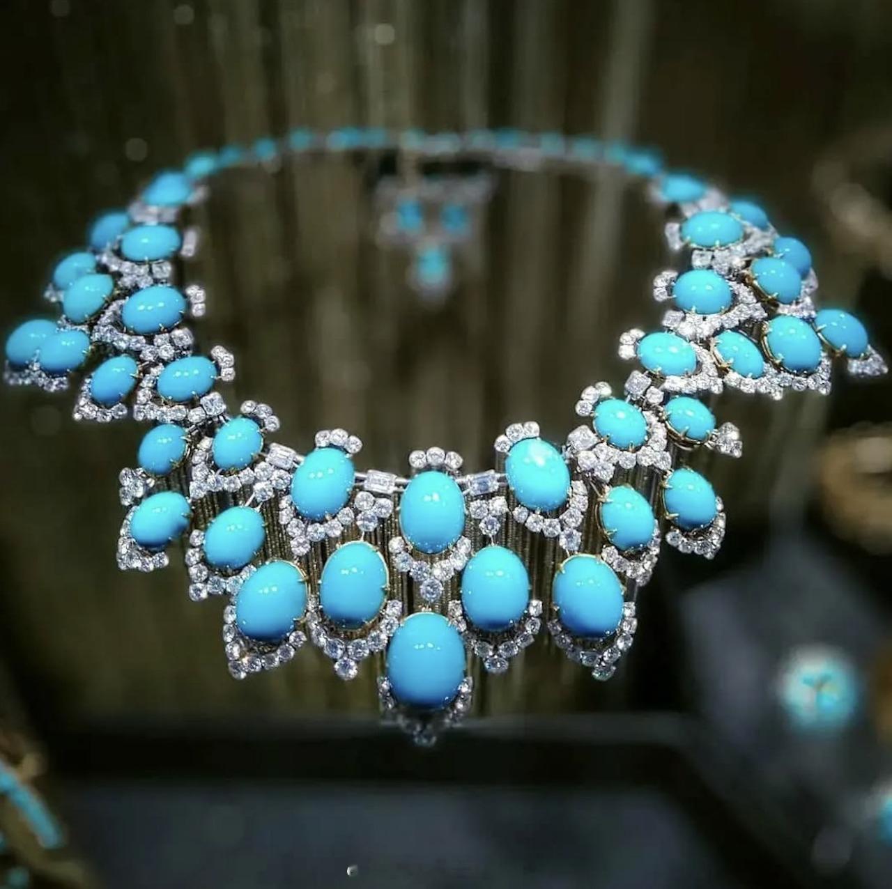 珠宝 宝格丽的绿松石套装,包括项链、耳环和手链,曾属于绿色某教什叶派的伊斯玛仪派精神领袖(很有钱)阿迦汗三世的第四任伊冯娜。约制作于上世纪60年代,即阿三死后,伊冯娜寡妇时期仍活跃于欧洲各路宴席,还曾用手链装点过发髻。伊凡娜没孩子遗产捐慈善,珠宝在2000年都卖了,这套2018年展览过 资料:royalwatcherblog