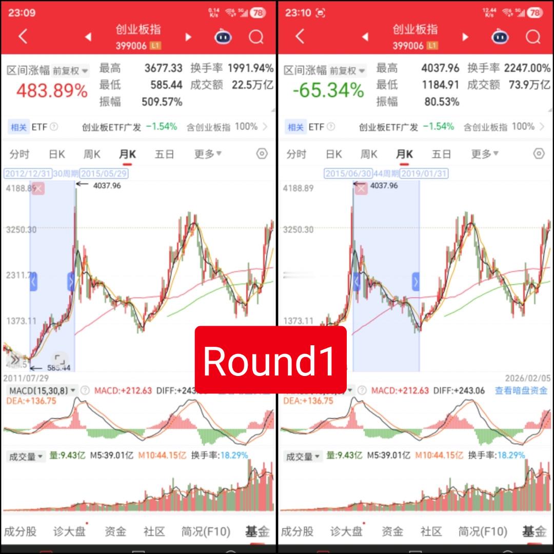 【第一回合,创业板用30个月涨了484%,然后44个月跌了65%】——————这历时74个月的第一回合时间稍有点久远,经历了这场牛熊的,最年轻也得是90后年龄靠前的。