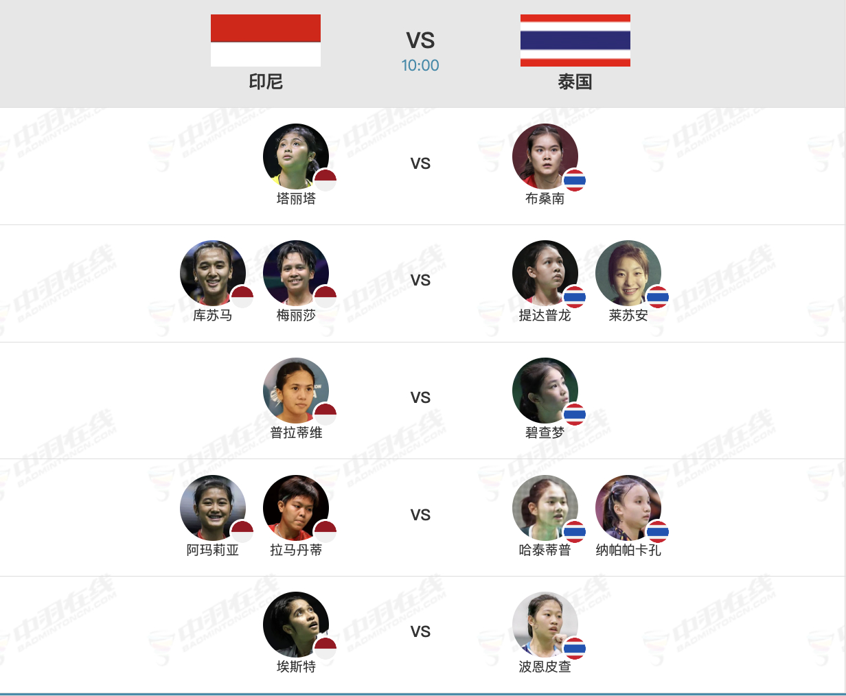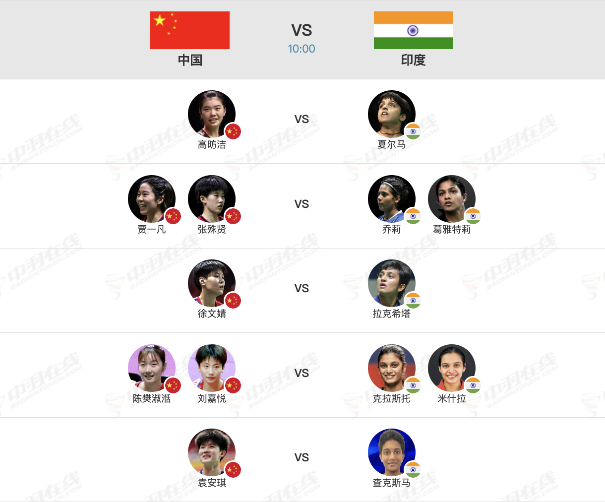 2026亚洲羽毛球团体锦标赛 女团8进4对阵名单,早上10点开赛:【8进4:中国🇨🇳 vs 🇮🇳印度】1、高昉洁🇨🇳 vs 🇮🇳夏尔马2、贾一凡/张殊贤🇨🇳 vs 🇮🇳乔莉/葛雅特莉3、徐文婧🇨🇳 vs 🇮🇳拉克希塔4、陈樊淑湉/刘嘉悦🇨🇳 vs 🇮🇳克拉斯托/米什拉5、袁安琪🇨🇳 vs 🇮🇳查可斯马中国羽毛球队