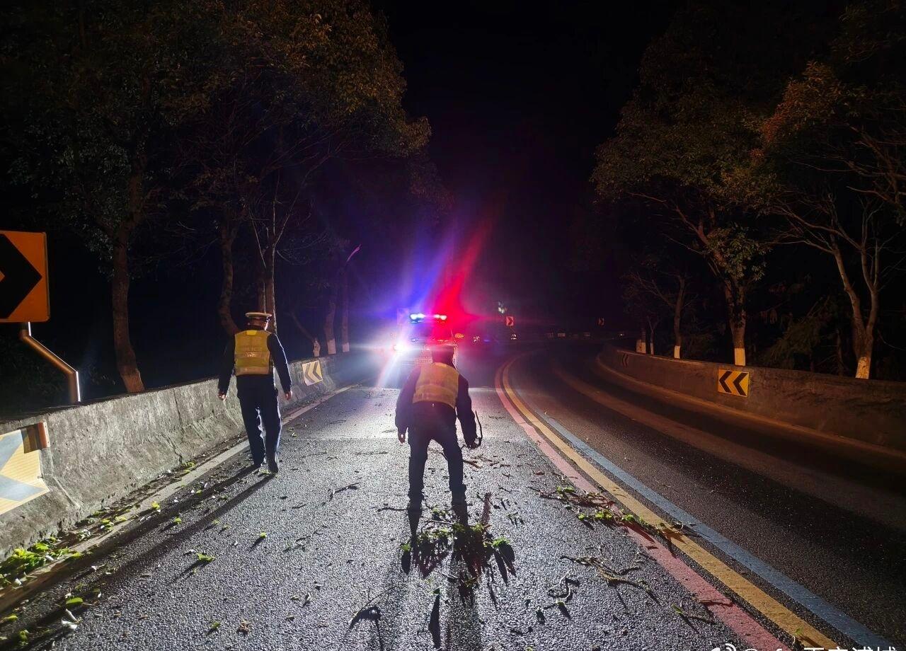 【暖心警事|五显岭上,他们在黑夜中“清障”】2月4日22时许,浦城县公安局交通管理大队接到报警:“五显岭上坡路段有货车刮断了树枝,枝干悬在半空,还有不少掉在路中间,太危险了!”此时夜色已深,五显岭路段弯急坡陡,悬垂的树枝和散落的枝干成了过往车辆的“隐形杀手”。交警迅速携带工具赶赴现场。寒风刺骨,警灯闪烁。交警第一时间设置警示区域,指挥车辆减速避让。他们合力拉下悬在空中的树枝,又将路面散落的枝干一一清理,迅速消除了隐患。黑夜中,荧光绿的警服成了最让人安心的颜色。@浦城公安