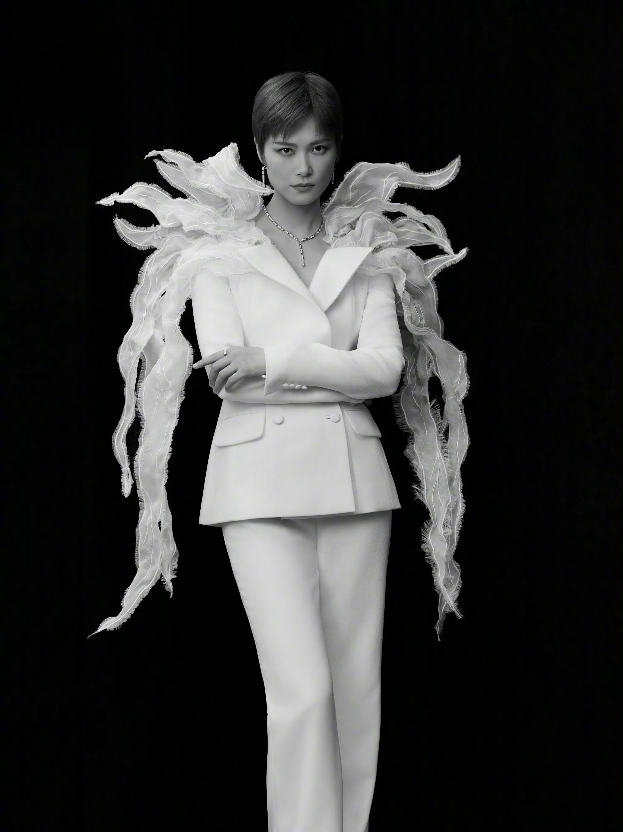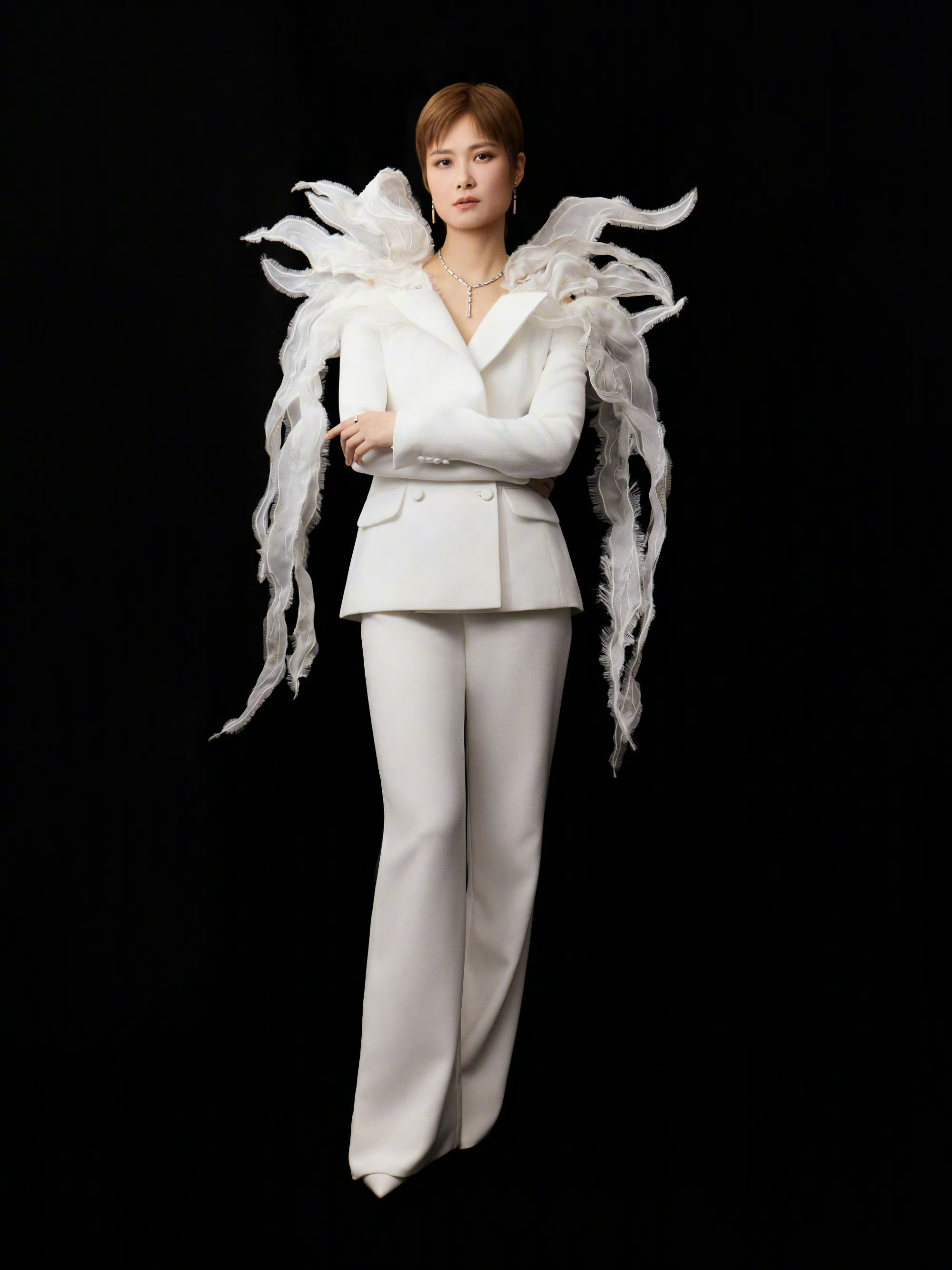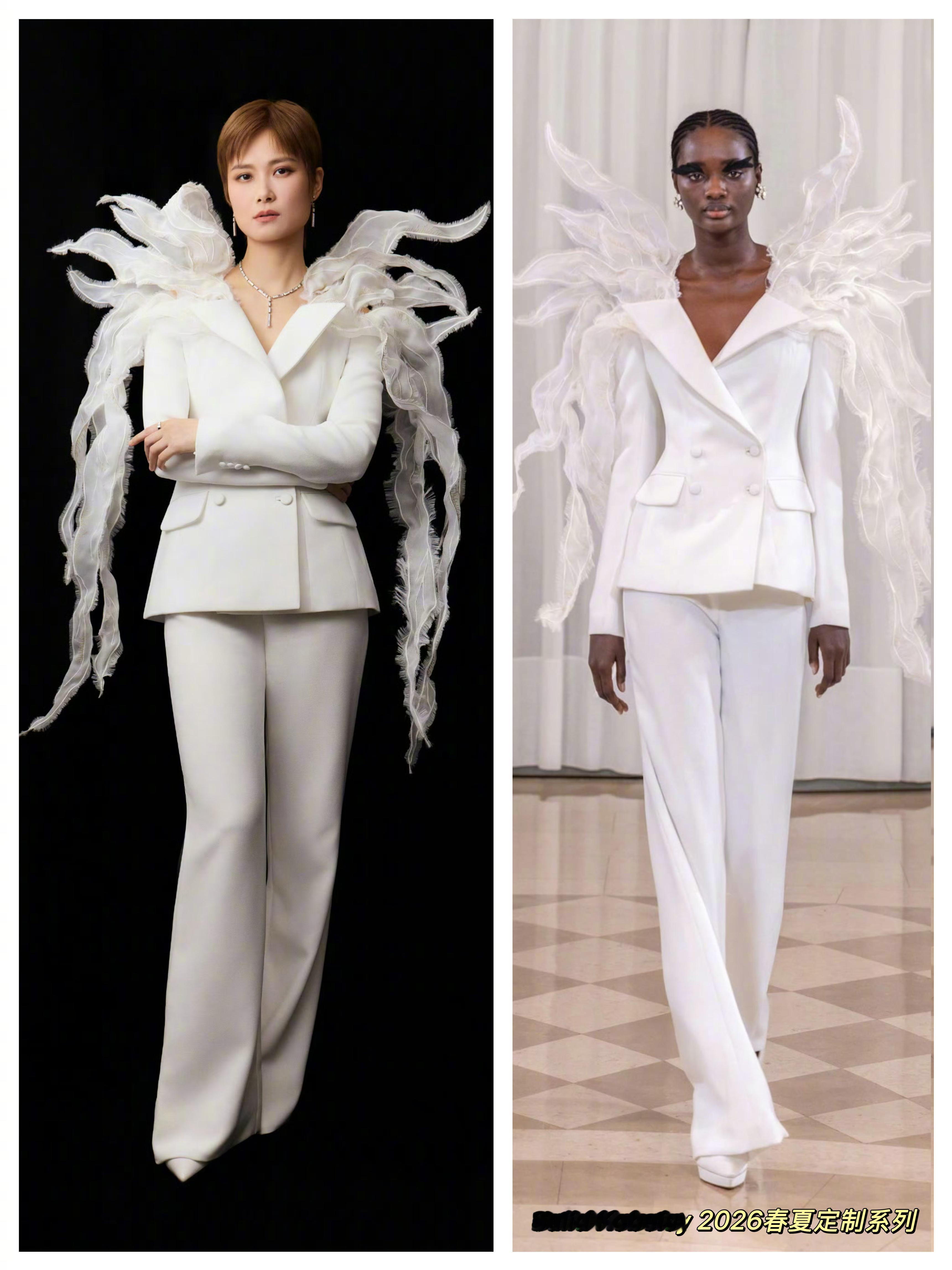李宇春 微博之夜 第二套造型,10天前刚于巴黎发布的Saiid Kobeisy 2026春夏定制系列,火速上身演绎,以白色的优雅套装为基底,别致的肩部纱质立体装饰,时尚女王的战绩依旧强势。微博之夜红毯造型 李宇春 红毯女王
