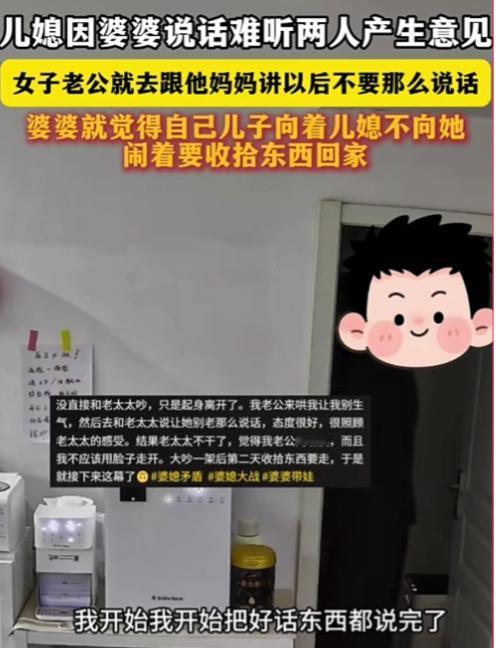 没有婆婆拆不了的家。 儿媳因婆婆说话难听,两人产生矛盾,老公就去跟他妈妈讲以后不要那么说话。婆婆就觉得儿子向着儿媳不向她,闹着要收拾东西回家。 “我怕这个,你知道我怕啥,你来威胁我吗?我让你让我跟你说啥呀。你这个自私的东西,你纯粹是个白眼狼,叫我天天跟你装笑脸啊。” 儿子好话说尽,结果换来一句“白眼狼”,这直接道德绑架了。这妈是有多见不得儿子对儿媳好啊,不站自己这边,就是不孝顺的种。 儿媳是不对,甩脸色了。但儿子都出来当“和事佬”,好话说尽,哄了半天的情况下。台阶都摆好了,这妈依旧不下还僵着,非要收拾东西回家,就有过了。 最好的办法,观念不同避免同住,各过各的,距离产生美,保持基本和谐就可以了。
