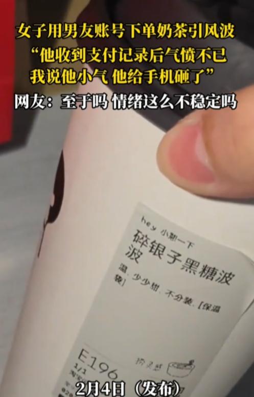 女子用男友账号下单奶茶,男友收到支付记录后气愤不已,女子说他小气,男友直接把手机砸了。 一看,奶茶,喜茶的碎银子黑糖波波,25元。为了25元,把上千元的手机砸了,这情绪是失控了。有的男自私的很,宁可给自己花钱买新手机,也不愿意给女朋友买奶茶。 但是,很显然女子是知道男友支付密码,花钱的时候,男友是被动知道的。他自己的钱,没有知情权。 如果打过招呼,经同意,用了就用了。即使花再多,男的大部分都不会说什么。但是,不告而动就是偷,男友身份不代表女子就有资格动他的财产,这次是奶茶,下次又会是什么。很明显女子没有一点边界感。 当然,男友的处理方式偏激了,如果因为一杯奶茶发火而闹掰,对双方而言未必不是好事,说明俩人不适合。 人生的一课,无论男女,永远不要觉得花除自己以外的人的钱,是理所当然的,包括自己的父母。