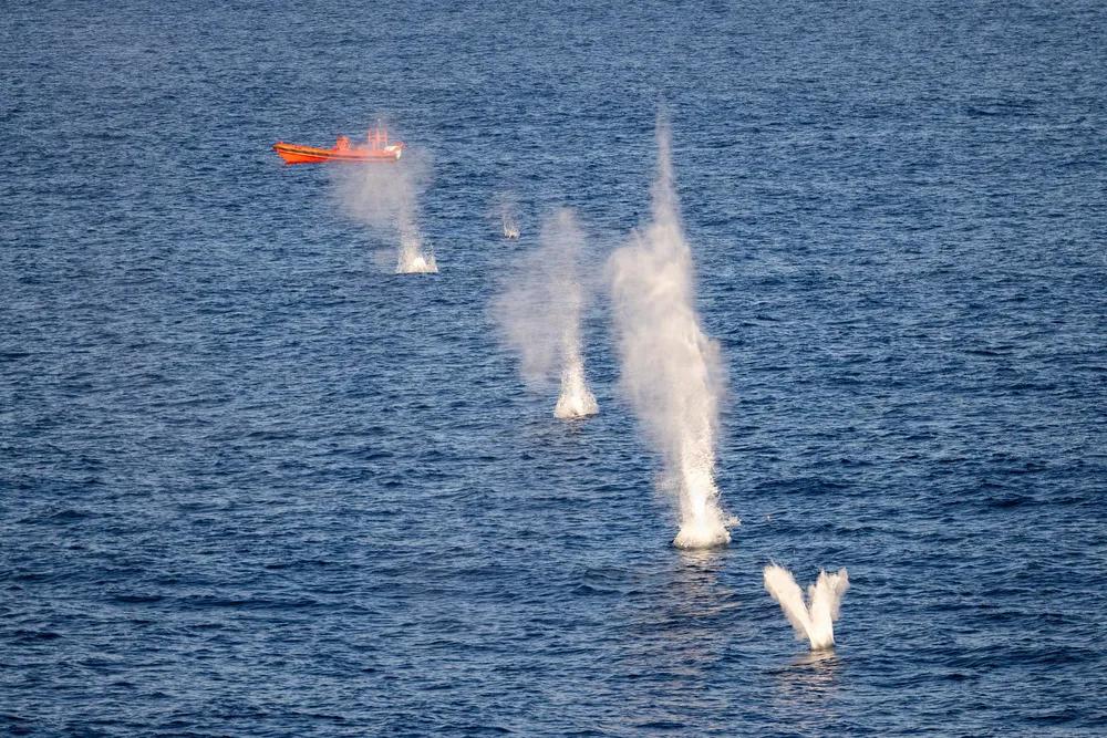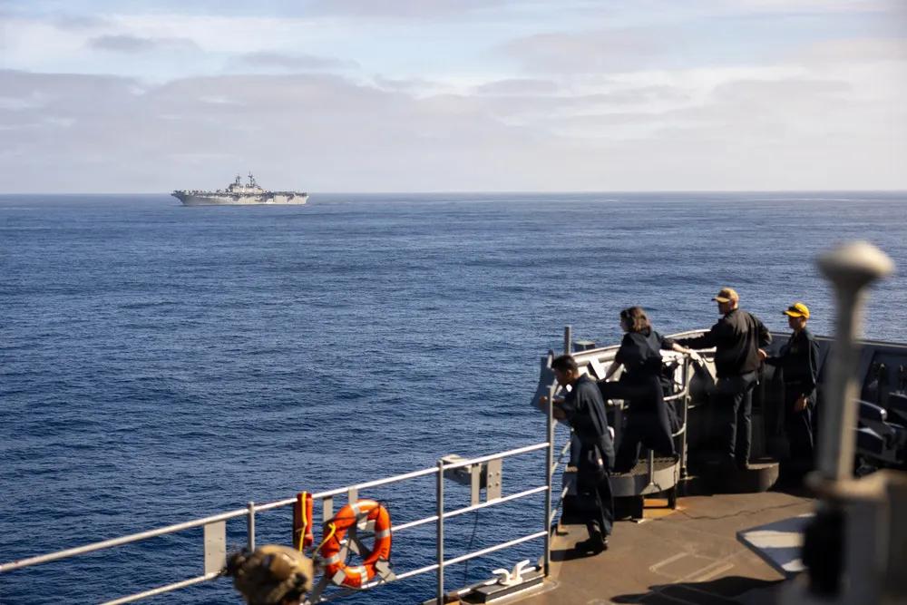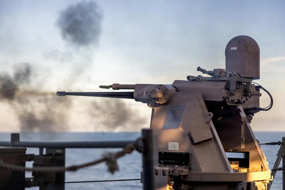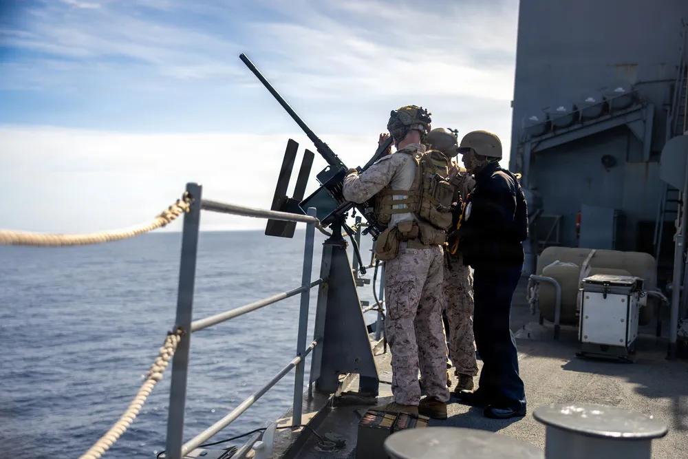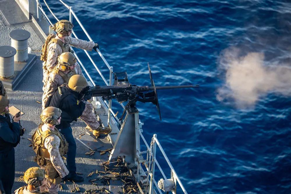 2026年2月2日,太平洋,美国海军陆战队员隶属于第11海军陆战队远征部队,第一海军陆战队远征军,在太平洋惠德比岛级船坞登陆舰康斯托克号(LSD 45)上进行实弹射击整合射击,准备装载M2 .50口径机枪。第11海军远征部队目前正在美国第三舰队作战区的拳师两栖准备群上执行综合训练,提升杀伤力和作战准备能力。