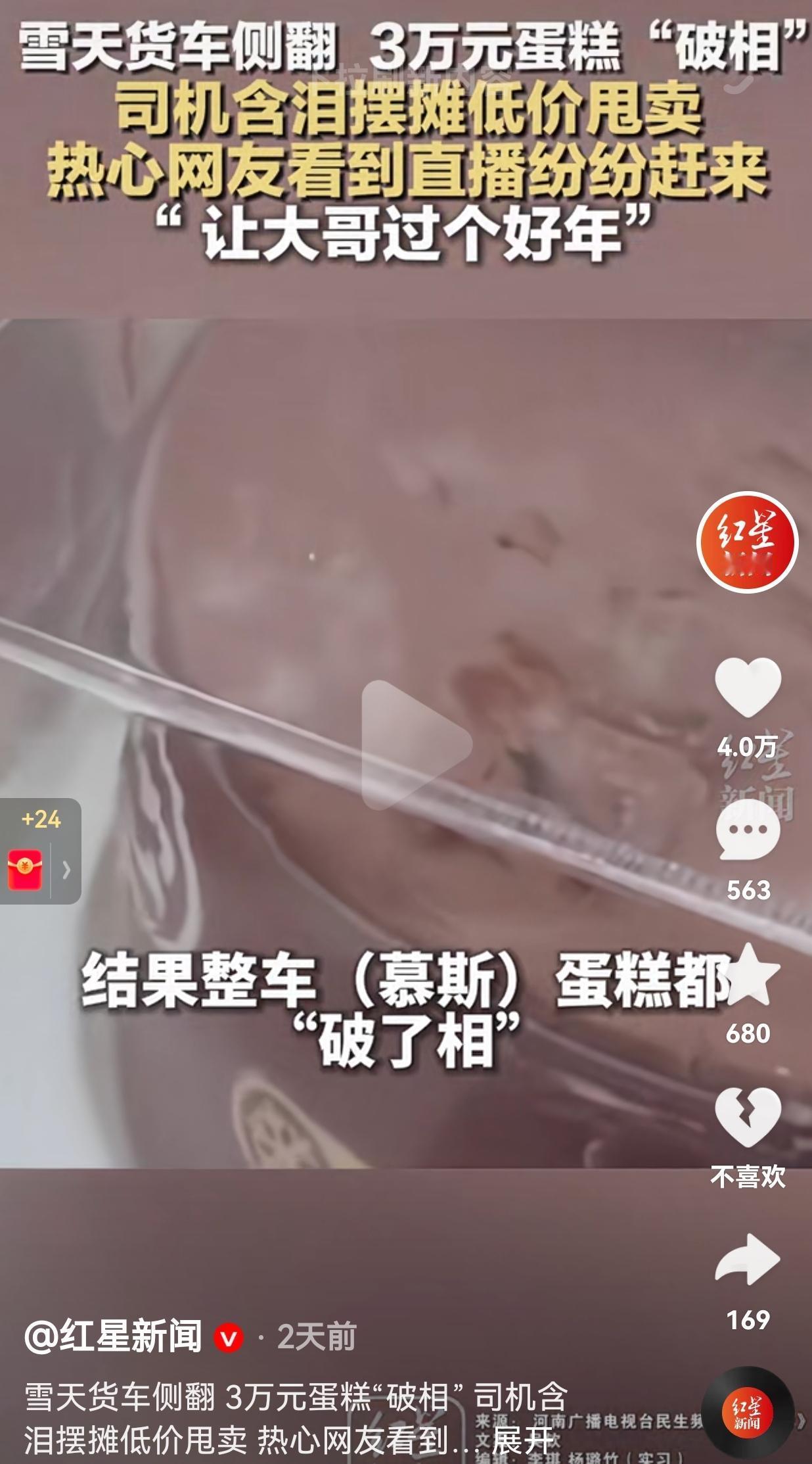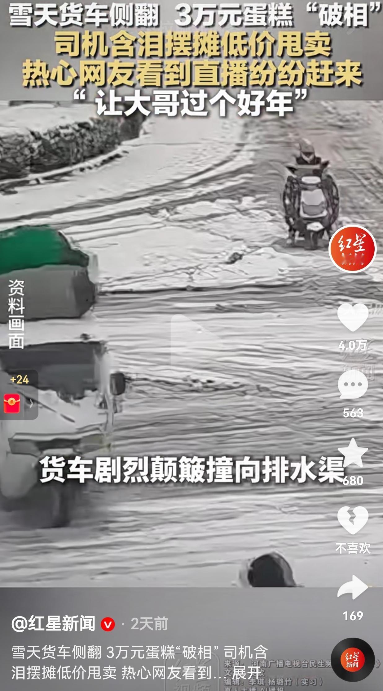太暖心了!1月26号,郑州下了一场大雪,路面特别滑。虽然不适合出行,但是,为了生活,秦师傅拉着一车价值3万元的慕斯蛋糕送货,结果一个没稳住,货车直勾勾地撞向了排水渠。 等他爬出来一看,心都碎了。好好的蛋糕全都破了相,奶油挤得歪歪扭扭,包装盒也撞得变了形。 更让他绝望的是,等他把蛋糕送到商家处,商家直接以“不完美”为由拒收了。 这3万块钱,可不是小数目,秦师傅急得直跺脚,眼看过年了,一家老小还等着这笔钱,秦师傅只能在路边支起摊子,并开启了直播,在直播中,他声音沙哑,眼里满是焦急,抹着眼泪把原价几十块的蛋糕,按远低于成本价的10块、20块甩卖。 好在,善良永远比雪天更暖。有人把秦师傅摆摊的画面发到了网上,直播刚开,四面八方的郑州人就赶来了。 现场排起了长队,有小伙子一下买了200块钱的,说“给公司同事分着吃”。有姑娘拎着好几盒,说“给家里老人孩子尝个鲜”。还有人根本没问价格,直接扫码付款,就想让大哥能早点回家。 众人不仅抢着买蛋糕,还主动帮忙搬运、宣传,嘴里念叨着“帮大哥一把,让他过个好年”。 不到一天时间,一车“破相”的蛋糕被抢光了。秦师傅红着眼眶说:“郑州人太好了,让我能过个好年。” 网友看到后评论说:“谁的生活都不容易,能帮一把是一把,这才是过年该有的样子。” 也有的网友说:“这就是河南人!骨子里的善良和热心,刻在骨子里的仗义。” 还有的网友说:“愿每个努力生活的人,都能被世界温柔以待。” 其实我们都明白,大家抢的不是蛋糕,是一份不忍心,是对大哥悲惨遭遇的共情。 它让我想起一句话:善良是会传染的。你帮了别人一把,下一次,就会有另一个人拉你一把。 生活里总有突如其来的意外,可能是一笔赔本的生意,可能是一次摔碎的蛋糕。但只要我们愿意伸出手,那些狼狈不堪的时刻,就会变成照亮彼此的光。 对此,你怎么看?
