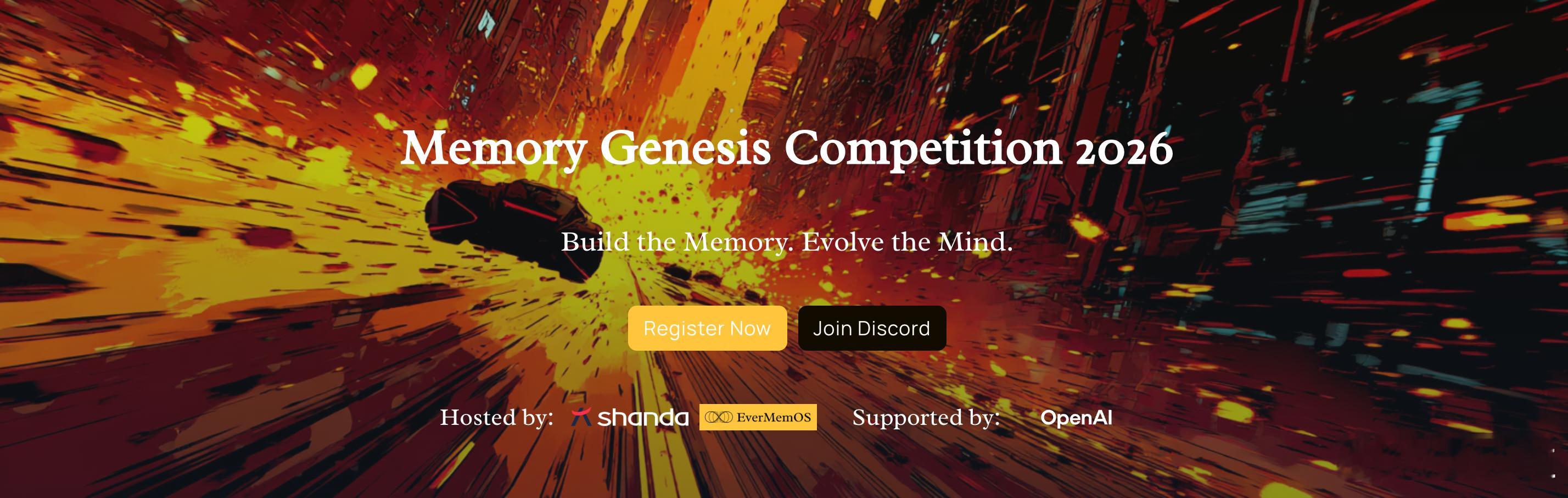 不止如此,EverMind更是联手OpenAI等十多个技术社区豪掷英雄帖,发起首届记忆起源大赛(Memory Genesis Competition 2026),号召全球顶尖人才前来共同书写记忆元年。