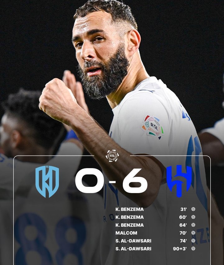 直播吧02月06日讯新月本轮6-0横扫阿科多,新援本泽马只用了不到70分钟就戴帽并有1次助攻。