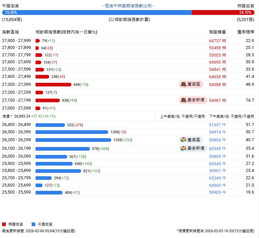 中信证券牛熊证街货分布图中的数据显示,熊证街货重货区在27300-27399区间,该区间最新熊证数量为644张,较上一交易日增加76张;熊证街货最多新增在27100-27199区间,该区间最新熊证数量为438张,较上一交易日增加99张。