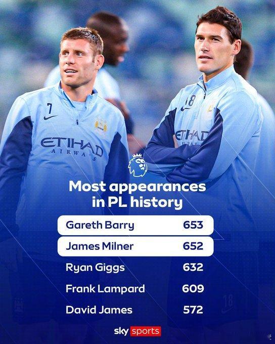 这个周末如果能上阵,40岁的米尔纳将追平昔日队友巴里保持的653场英超上场记录,“活化石”!