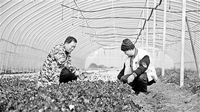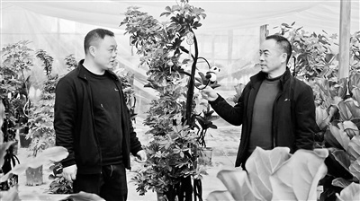 上图工作人员在河南省潢川县付店镇晏庄村中旭市政花草公司种植基地种植花草。下图在河南省潢川县付店镇晏庄村果丰家庭园艺基地,晏庄村党支部书记施少强(右)与基地负责人探讨产业发展前景。陈恒宇摄