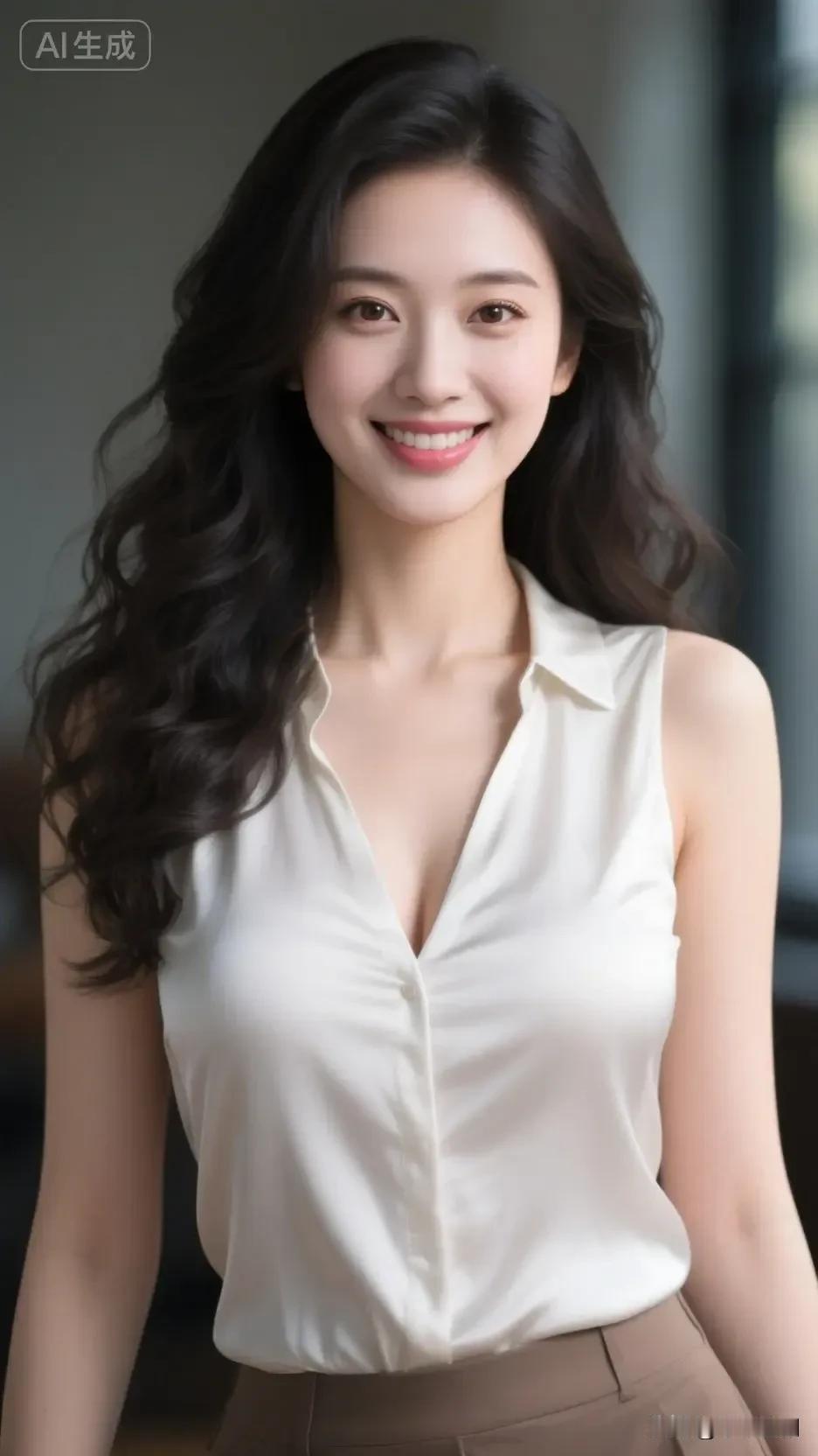 米白缎面衬着柔和笑意,蓬松卷发随步伐轻晃。她的笑容像揉碎的暖阳,在简约的通勤穿搭