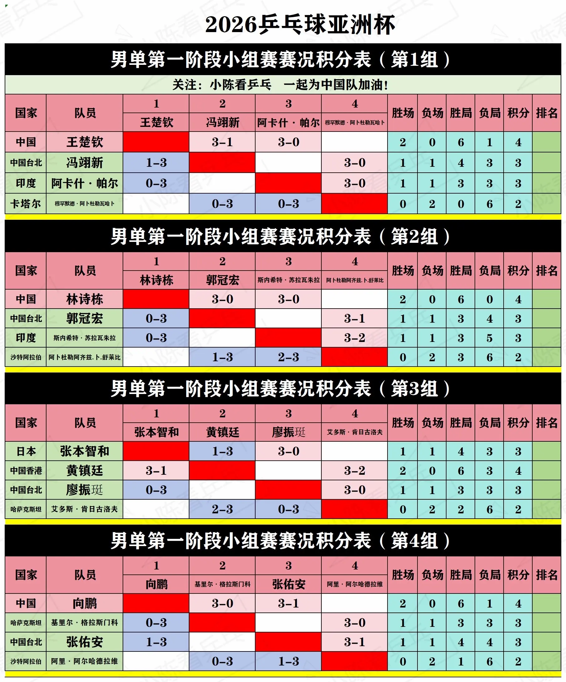 2026乒乓球亚洲杯第1阶段循环赛积分表。2026乒乓球亚洲杯第1阶段循环赛第2轮后积分表,中国队继续加油。