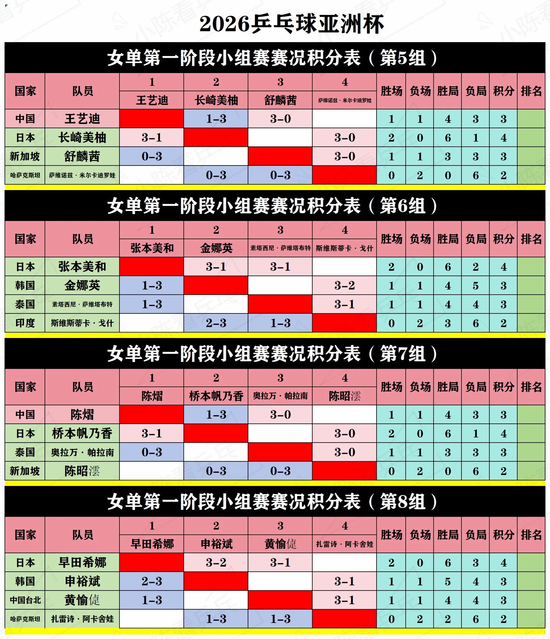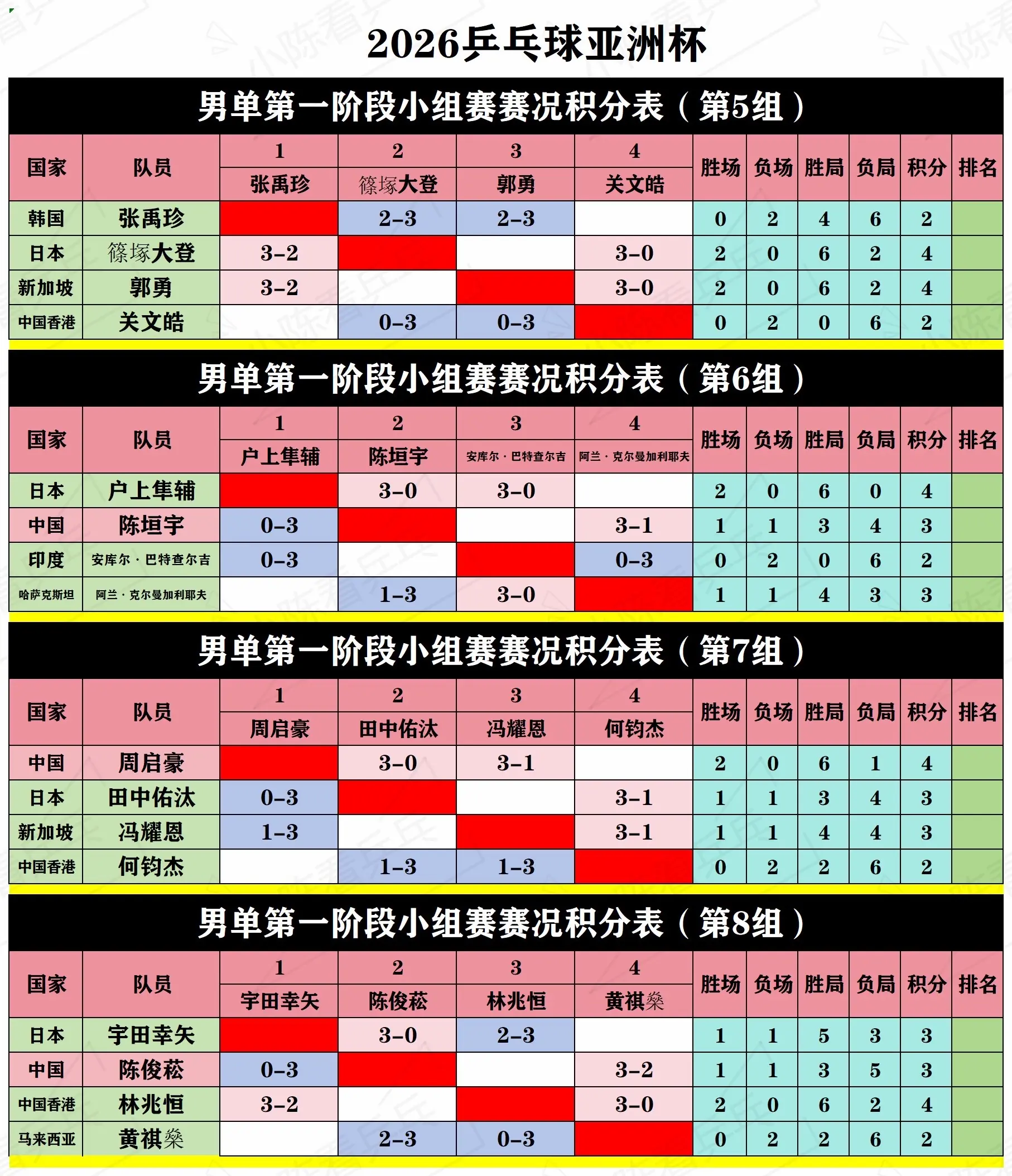 2026乒乓球亚洲杯第1阶段循环赛积分表。2026乒乓球亚洲杯第1阶段...