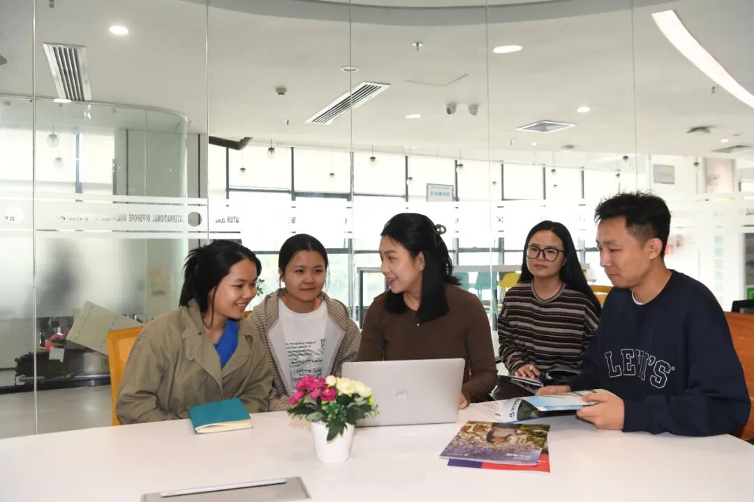 在海口复兴城互联网信息产业园,知行见(海南)教育科技有限公司总经理仇芳(中)正在和同事讨论工作事宜。