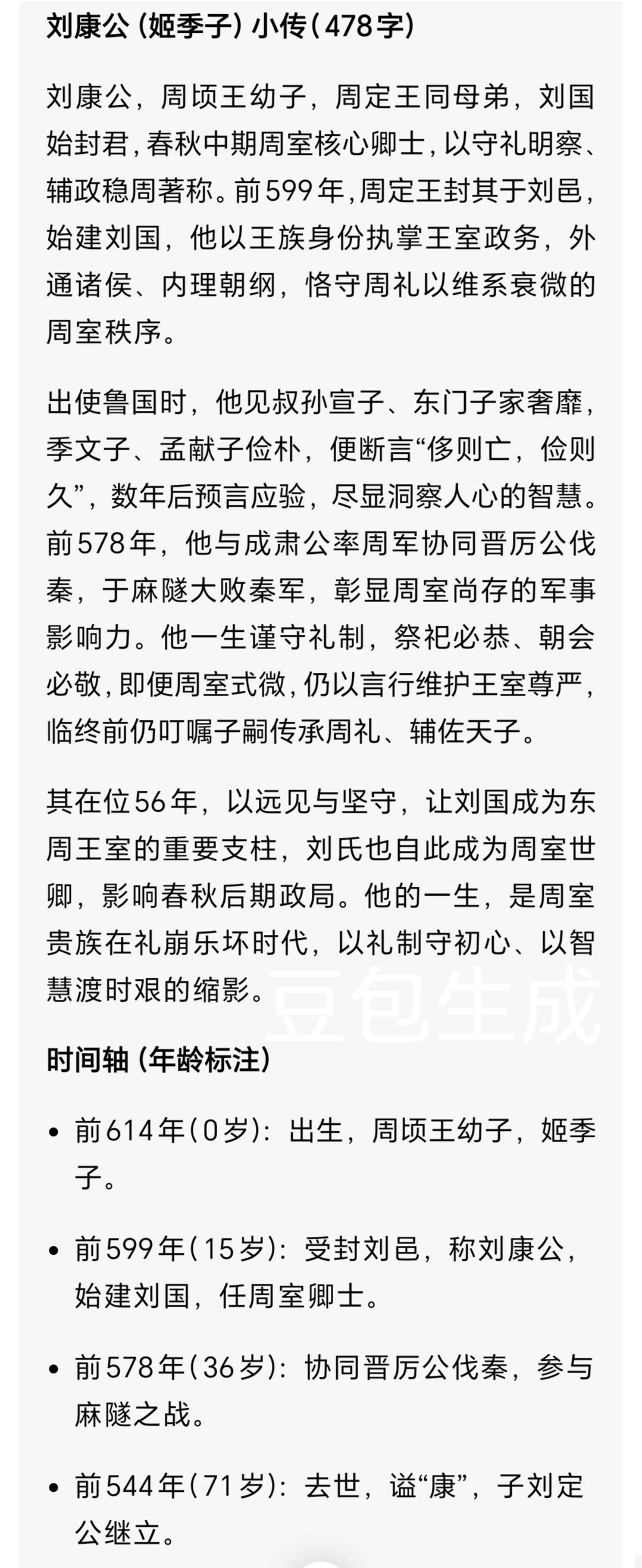 周室王子守礼法,三预言皆应验,春秋智者的生存之道 春秋乱世,周王室日渐衰微,诸侯争霸不休,礼崩乐坏成了时代底色。在这样的困局里,周顷王之子刘康公,没有靠武力争雄,却以“守礼、识人、知命”的智慧,在乱世中站稳脚跟,三次预言一一应验,一场败仗悟透生存法则,成为东周王室最特别的“礼法守护者”。他的一生,藏着乱世之中普通人与贵族都该懂的处世智慧。 刘康公,姬姓,刘氏,名季子,谥号“康”,因食采于刘邑(今河南偃师西南)得名。他是周顷王的幼子,周定王的同母弟,自幼生长在洛邑王城,见惯了王室的窘迫与诸侯的骄横。彼时的周王室,早已失去天下共主的权威,只能在晋、楚等大国的夹缝中求存,刘康公从小便明白,王室的尊严,早已不是靠武力,而是靠对礼法的坚守来维系。公元前599年,周定王八年,他受封刘邑建立刘国,同时出任王室卿士,正式踏入春秋政治舞台。 一、聘鲁观侈:一眼看透家族兴衰,礼法是人心的标尺 同年,刘康公奉命出使鲁国,为鲁君分发王室聘礼。鲁国是周公后裔,本是周礼的践行者,可此时鲁国卿大夫家族已暗流涌动。刘康公在鲁都曲阜停留期间,细致观察着季文子、孟献子、叔孙侨如、东门归父四位执政大夫的言行:季文子居所简陋,车马无华,连家臣都衣着朴素;孟献子行事恭谨,日常用度皆合礼法;而叔孙侨如出行仪仗奢华,东门归父更是挥霍无度,府邸陈设远超卿大夫规制。 回国后,周定王问他鲁国大夫的贤愚,刘康公直言:“季、孟二氏能长久,叔孙、东门必亡。”他的判断并非凭空而来,而是基于“俭则固,侈则亡”的礼法逻辑——俭朴能让人坚守礼法、凝聚人心,奢侈则会让人失德越矩,最终招致祸端。他还特别指出,东门氏地位不及叔孙氏,却更骄奢,难以侍奉两代君主;叔孙氏恃宠而骄,必因乱政出逃。 不到十年,他的预言尽数成真:东门氏被鲁君驱逐,家族覆灭;叔孙侨如勾结齐国作乱,事败后逃亡卫国。这不是玄学,而是刘康公对人性与礼法的深刻洞察,在乱世中,礼法从来不是空洞的教条,而是安身立命的根本。 二、伐茅戎之败:一次侥幸,让他悟透“守信”的重量 公元前590年,晋国出面调解周王室与茅戎的矛盾,双方歃血为盟,约定互不侵犯。可刘康公却动了投机的心思,他觉得戎人质朴无备,若趁盟约达成、戎人放松警惕时突袭,定能一举平定边患,为王室立威。内史叔服得知后,极力劝阻:“背弃盟约是失信,欺骗大国是失义,失信失义,必遭天谴,此战必败。” 刘康公被功利冲昏头脑,执意亲率王师出征,结果在徐吾氏(今山西平陆)被茅戎伏击,王师大败而归。这场败仗,成了他人生的转折点。此前的他,凭借王室身份与识人智慧顺风顺水,此战之后,他站在洛邑的城墙上,看着残兵败将,终于明白:乱世之中,投机取巧或许能得一时之利,可坚守信义、敬畏礼法,才是长久之道。从此,他彻底摒弃侥幸之心,将“敬、信、礼”刻进骨子里,成为王室礼法最坚定的捍卫者。 三、太庙论敬:礼法为刃,直指人心的敬畏 公元前578年,周简王命刘康公、成肃公会合晋、鲁等诸侯讨伐秦国。出征前,王室在太庙举行祭祀,分赐祭肉(脤,shèn),成肃公接受祭肉时态度轻慢,随意将祭肉放在一旁,毫无恭敬之心。刘康公当场厉声斥责:“人受命于天地,行事需有礼义威仪的准则,才能安身立命。祭祀与战争,是国家的头等大事,你如此不敬,怕是难以活着归来!” 他的话并非诅咒,而是对“敬”的深刻解读:“君子勤礼,小人尽力。敬在养神,笃在守业。” 对天地、礼法、国家大事的敬畏,是为人处世的底线。最终,成肃公在伐秦途中病逝,再次印证了刘康公的判断。同年,晋国大夫郤至与周王室争夺温邑的田地,周王派刘康公与单襄公赴晋交涉。面对郤至的骄横跋扈,刘康公不卑不亢,以“天子之田,诸侯不得私争”的礼法为据,层层辩驳,最终迫使郤至退让,为王室保住了尊严。 四、以礼传家:乱世之中,家风是最硬的底气 刘康公的一生,始终践行“敬、俭、礼”的准则,他主张“宽肃宣惠,君之道也;敬恪恭俭,臣之道也”,认为君主当宽厚肃穆、广施德惠,臣子当恭敬谨慎、节俭守礼。他的思想,不仅影响了东周王室,更成为后世儒家礼治思想的重要源头。 作为刘国的开国之君,他没有给子孙留下金银珠宝,而是留下了“守礼、俭朴、守信”的家风。刘氏后人世代坚守此道,在春秋数百年的乱世中,刘国始终是周王畿内最稳定的诸侯国之一,从未因内乱或外患覆灭。而刘康公本人,也以“智者、守礼者”的形象,被《左传》《国语》详细记载,成为春秋时期被后世铭记的政治家。 乱世之中,最强大的武器从来不是武力,而是内心的坚守。刘康公用一生证明,敬以待人,俭以律己,礼以行事,即便身处风雨飘摇的时代,也能站稳脚跟,守住本心。 你觉得在当下,“守礼、守信”的处世准则,还能帮我们解决哪些生活难题?欢迎在评论区分享你的看法~ 历史 春秋人物 刘康公