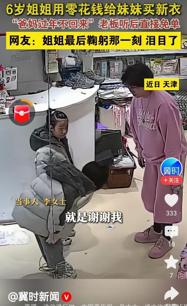 6岁姐姐给妹妹买新衣,老板免单的瞬间看哭了 天津一家童装店里,6岁的姐姐攥着攒了很久的零花钱,带着冻得发红的小手和没穿棉袄的妹妹,想给她买件20多块钱的新外套。 老板瞬间红了眼眶,不仅免了单,还悄悄给姐妹俩各加了一件外套,塞了两副保暖手套。 临走前,6岁的姐姐对着老板深深鞠了一躬,小声说“谢谢”。 这一幕被网友拍下,戳中了无数人的泪点。 孩子的懂事让人心疼,老板的善良让人温暖。 在这个冬天,最暖的不是新衣,是陌生人之间不动声色的温柔。 女童新衣