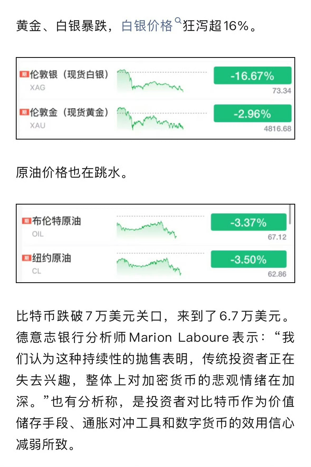 黄金白银比特币暴跌北京时间2月6日凌晨,全球资产黑色星期四! 比特币暴跌超12%跌破7万美元,以太坊跌超13%。现货白银暴跌超20%,创2008年以来最大盘中跌幅;黄金大跌超4%。美股三大指数齐跌,纳指三连跌抹去全年涨幅,科技股领跌 。今天的大A又完了吧?