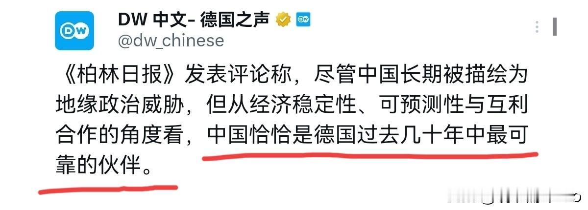 让人非常意外!德媒罕见承认,中国几十年来是德国最可靠的伙伴,而不是美国!2月6日,德国之声刊文表示,尽管中国长期被描绘为地缘政治威胁,但从经济稳定性、可预测性与互利合作的角度看,中国恰恰是德国过去几十年中最可靠的伙伴。德媒表示,美国政治的不确定性急剧上升,俄乌战争使德俄关系陷入决裂,而在此背景下,德国和欧洲必须重新审核对华关系。 德媒坦言,德国当时的红绿灯政府搞出“去风险化”战略还不够,为了彻底激怒中国,当时的时任德国外长贝尔伯克还公开批评中国,并对中国人开展了一番价值观说教。德国政界想必是真心相信,只要对中国使坏,就能遏制这个竞争对手的快速崛起。这无疑是一种严重的误判,更是强国走向衰败时的典型做法。现如今,即便媒体一再抹黑,也无法否认,中国已经在决定未来的关键产业中占据了领先地位。 德媒表示,欧洲最大的风险所在,并非中国,而是华盛顿,对美国欧洲恐怕要进行真正的去风险化。说实话,一贯对中国进行批评,抹黑的德国媒体竟然承认中国恰恰是德国过去几十年中最可靠的伙伴,并批评前任“红绿灯”政府的错误做法,并意识到西方媒体对中国有了太多的抹黑,这当然感到非常的意外。为什么德国媒体立场转变如此之大,一句话,事实和真相自有千钧之力,中国的发展,德媒已经完全做不到视而不见了。 并且,德媒恐怕比以往任何时候都前所未有的意识到美国的不靠谱和不值得信赖。当然,必须承认,西方的舆论界对于中国的态度正在进行转变,但是德国政界的转变似乎比舆论界慢很多。就在日前,德国外长瓦德富尔还声称,尽管存在紧张关系,德国仍坚定站在美国一边,德国与美国、中国的关系并非“等距”,华盛顿仍是欧洲、德国最重要的伙伴。不应因与美国的分歧而在战略上转向北京,展开双臂,向中国奔去。不过,尽管德国政界对我们有一些看法,但是作为形势逼人,德国对华态度恐怕也不得不更加务实了。