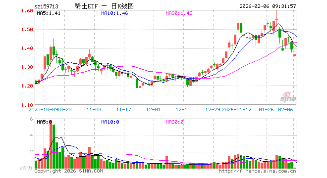 2月6日,稀土ETF(159713)开盘跌2.37%,报1.357元。稀土ETF(159713)重仓股方面,北方稀土开盘跌2.71%,金风科技跌0.24%,卧龙电驱跌1.01%,格林美跌1.77%,厦门钨业跌2.21%,中国铝业跌3.64%,领益智造跌1.36%,中国稀土跌2.53%,包钢股份跌0.84%,盛和资源跌3.39%。
