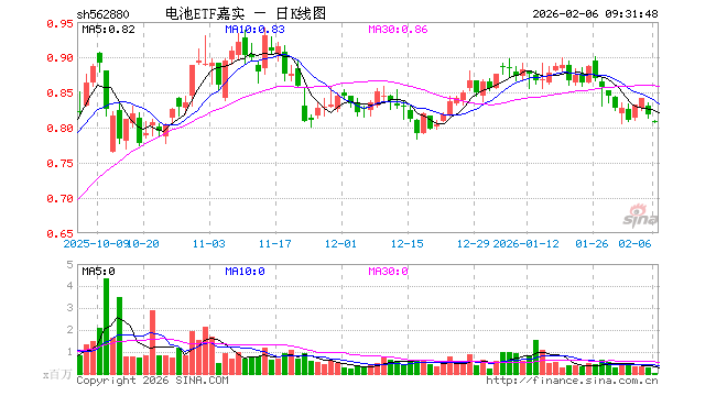 2月6日,电池ETF嘉实(562880)开盘跌1.22%,报0.808元。电池ETF嘉实(562880)重仓股方面,宁德时代开盘跌1.00%,阳光电源跌1.37%,三花智控跌1.46%,亿纬锂能跌0.99%,天赐材料跌1.22%,先导智能跌1.45%,格林美跌1.77%,国轩高科跌2.05%,多氟多跌0.86%,欣旺达跌0.69%。
